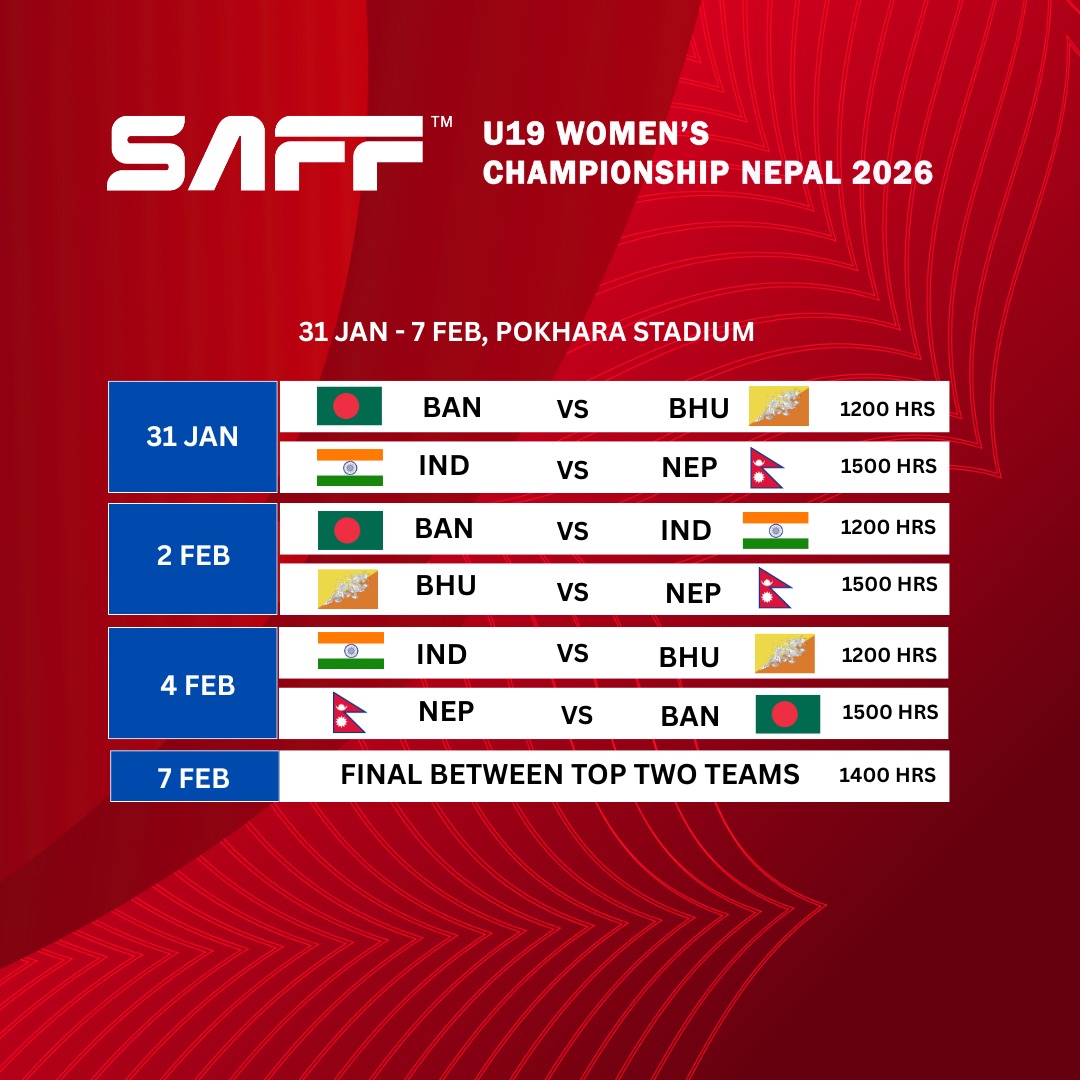 यही जनवरी ३१ देखि फेब्रुअरी ७ सम्म पोखरा रंगशालामा हुने साफ यु-१९ महिला च्याम्पियनसिपमा आयोजक नेपालसहित भारत, बंगलादेश र भुटानले भाग लिनेछन् ।