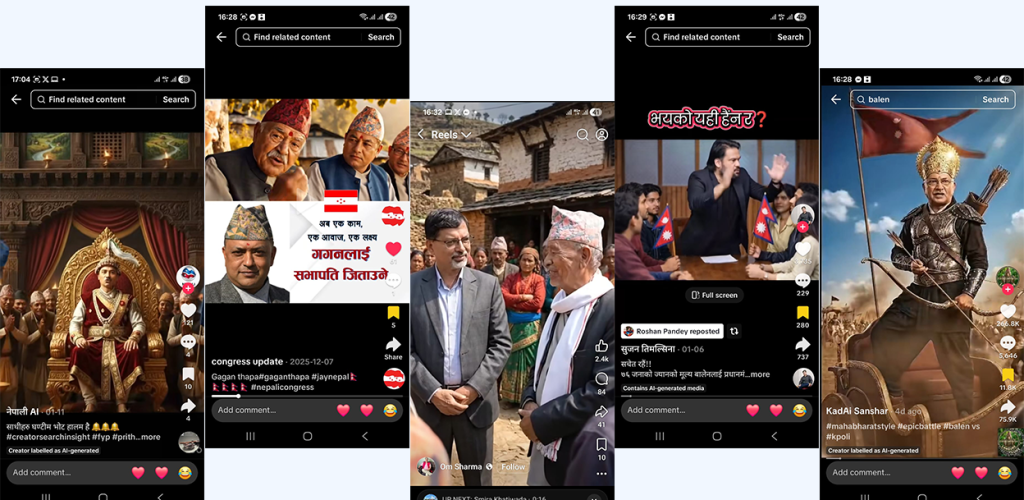 ‘हुक लाइन’ देखि आकर्षक एडिटिङले मतदातालाई प्रभावित पार्न तल्लीन छन्, नेता/कार्यकर्ता । यसमा माथि उदाहरणमा देखाइएको जस्तो एआईको प्रयोग झन् बढ्दो छ ।