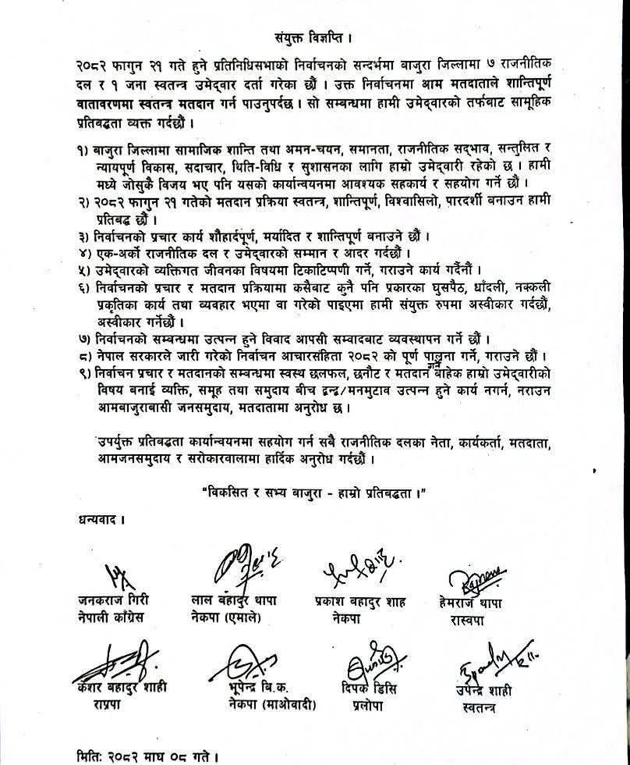 ८ माघ, काठमाडौं । प्रतिनिधिसभा निर्वाचनका लागि बाजुराबाट प्रत्यक्षतर्फ उम्मेदवार बनेका ८ जनाले चुनावलाई शान्तिपूर्ण बनाउने सामूहिक प्रतिबद्धता जनाएका छन् ।
