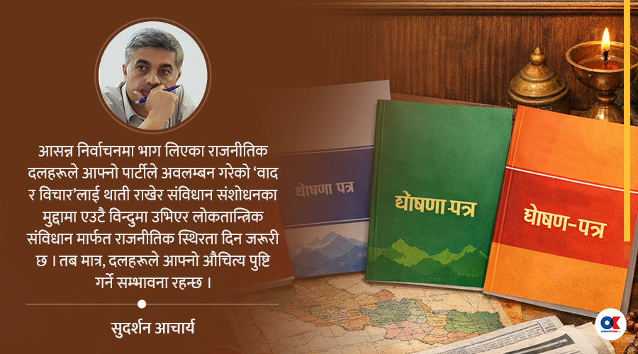 तसर्थ, आसन्न निर्वाचनमा भाग लिएका राजनीतिक दलहरूले आफ्नो पार्टीले अवलम्बन गरेको ‘वाद र विचार’लाई थाती राखेर संविधान संशोधनका मुद्दामा एउटै विन्दुमा उभिएर लोकतान्त्रिक संविधान मार्फत राजनीतिक स्थिरता दिन जरूरी छ । तब मात्र, दलहरूले आफ्नो औचित्य पुष्टि गर्ने सम्भावना रहन्छ ।