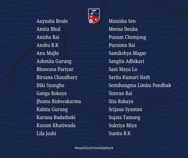 - सहायक प्रशिक्षक सन्देश कुमार श्रेष्ठ, गोलकिपिङ प्रशिक्षक सञ्जीव जोशी र टोली व्यवस्थापक दिपा छेत्री रहनेछन्।