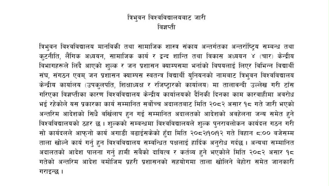 ‘शुल्कको सम्वन्धमा विश्वविद्यालयले शुल्क पुनरावलोकन कार्यदल गठन गरी सो कार्यदलले आफ्नो कार्य अगाडी बढाईसकेको हुँदा मिति २०८२/१०/१२ गते बिहान ८:०० वजेसम्म ताला खोल्ने कार्य गर्नु हुन विश्वविद्यालय सम्वन्धित पक्षलाई हार्दिक अनुरोध गर्दछ । अन्यथा सम्मानित अदालतको आदेश पालना गर्नु हामी सबैको दायित्व र कर्तव्य हुने भएकोले मिति २०८२ असार १८ गतेको अन्तरिम आदेश बमोजिम प्रहरी प्रशासनको सहयोगमा ताला खोलिने बेहोरा समेत जानकारी गराइन्छ,’ त्रिविको निर्देशनमा भनिएको छ ।