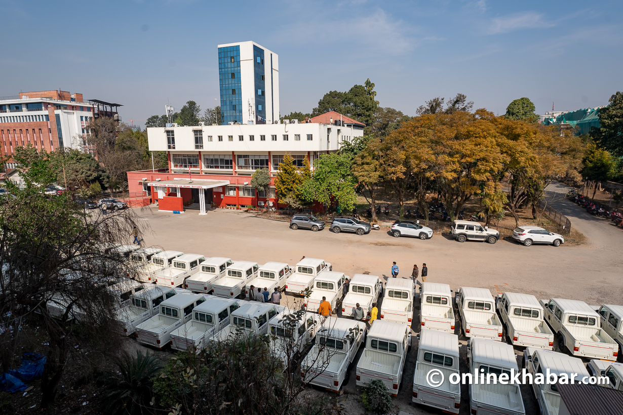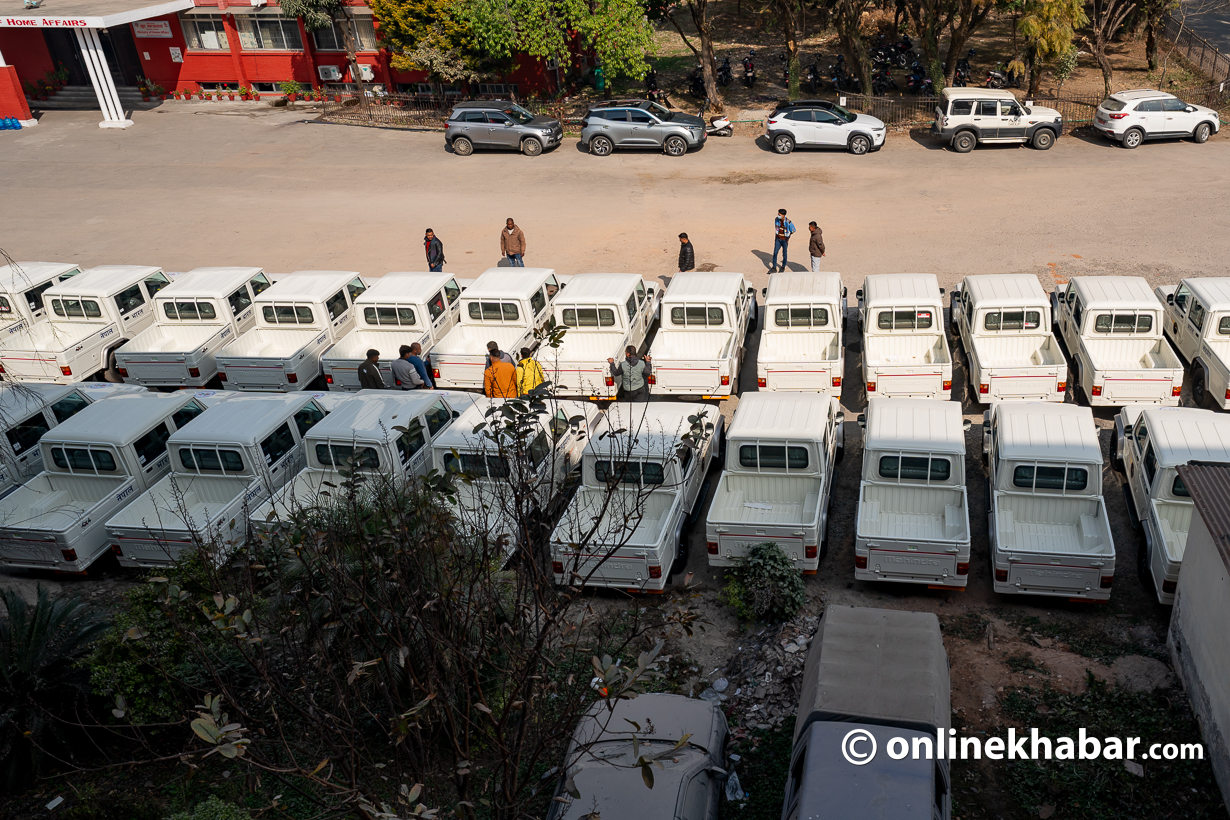 निर्वाचनका लागि भारत सरकारले नेपाल सरकारलाई हस्तान्तरण गरेका ६१ गाडी सिंहदरबारस्थित गृहमन्त्रालय अगाडि राखिएको छ ।