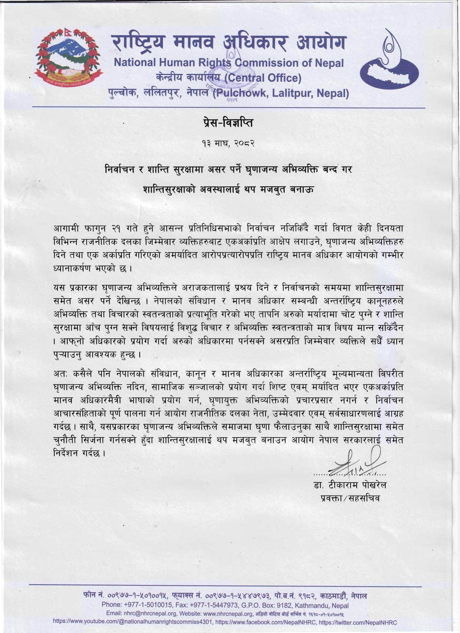 ‘आगामी फागुन २१ गते हुने आसन्न प्रतिनिधिसभाको निर्वाचन नजिकिँदै गर्दा विगत केही दिनयता विभिन्न राजनीतिक दलका जिम्मेवार व्यक्तिहरूबाट एकअर्काप्रति आक्षेप लगाउने, घृणाजन्य अभिव्यक्तिहरु दिने तथा एक अर्काप्रति गरिएको अमर्यादित आरोपप्रत्यारोपप्रति राष्ट्रिय मानव अधिकार आयोगको गम्भीर ध्यानाकर्षण भएको छ,’ आयोगले भनेको छ ।