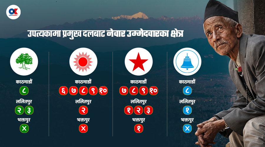 नेपाली कांग्रेस, नेकपा एमाले, नेपाली कम्युनिस्ट पार्टी(नेकपा), राष्ट्रिय स्वतन्त्र पार्टी (रास्वपा) र राष्ट्रिय प्रजातन्त्र पार्टी(राप्रपा) जस्ता प्रमुख दलले काठमाडौंको टिकट वितरणमा नेवार समुदायलाई खुम्च्याएका छन् ।