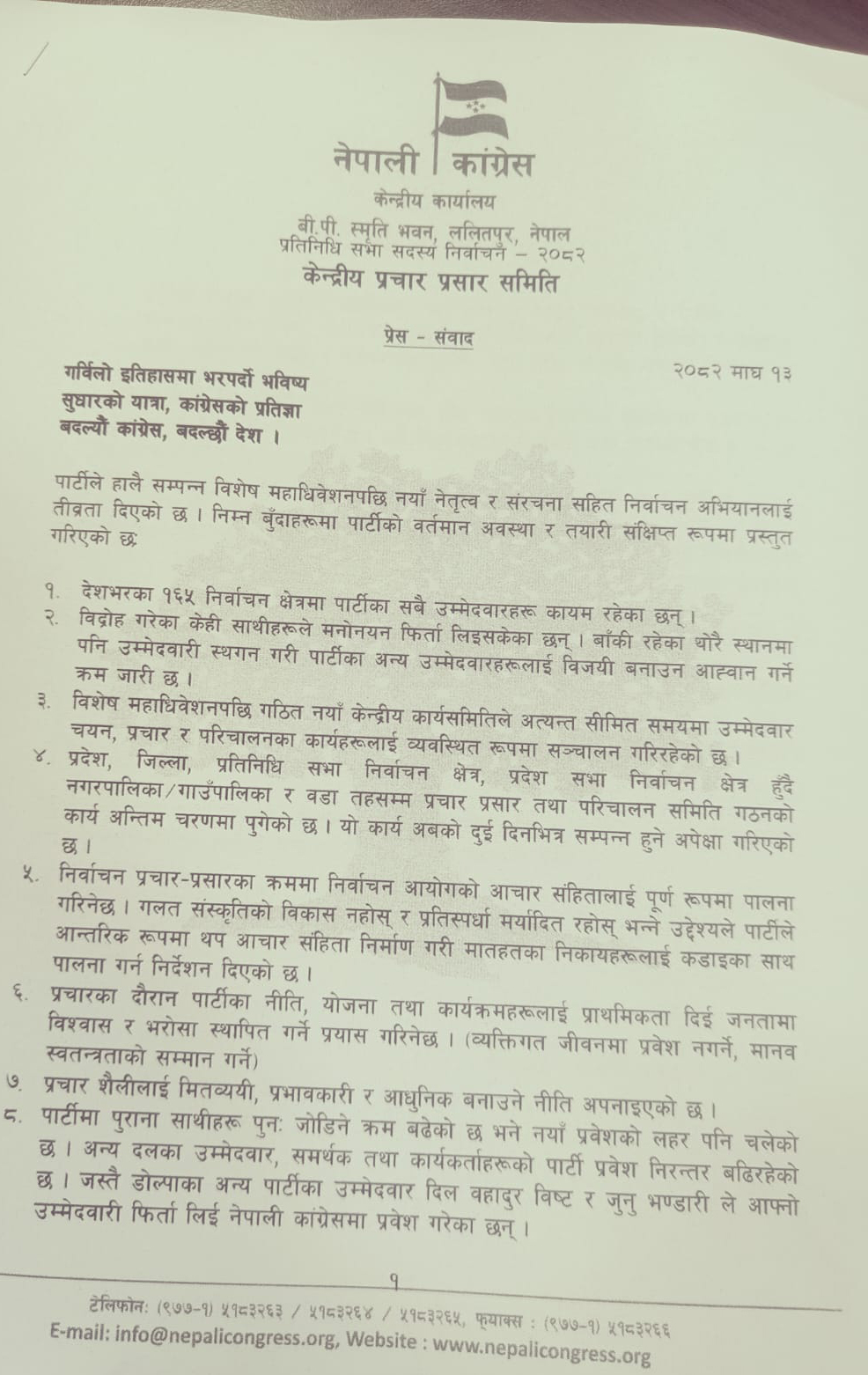 १३ माघ, काठमाडौं । उज्यालो नेपाल पार्टी (उनेपा) र मितेरी पार्टी नेपालका उम्मेदवार नै नेपाली कांग्रेसमा प्रवेश गरेका छन् ।