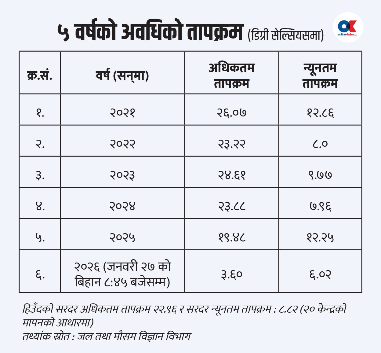 विभागका अनुसार पछिल्ला पाँच वर्षलाई हेर्दा सन् २०२० र २०२२ मा अधिकतम तापक्रम सरदरभन्दा कम मापन भएको छ ।
