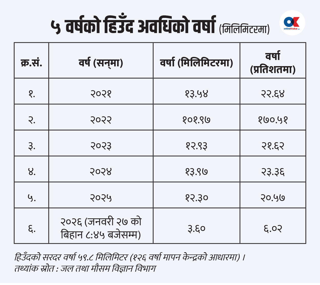 यसैगरी सन् २०२२ मा १०१.९७ मिलिमिटर, सन् २०२३ मा १२.९३ मिलिमिटर, सन् २०२४ मा १३.९७ मिलिमिटर र सन् २०२५ मा १२.३० मिलिमिटर वर्षा भएको छ ।