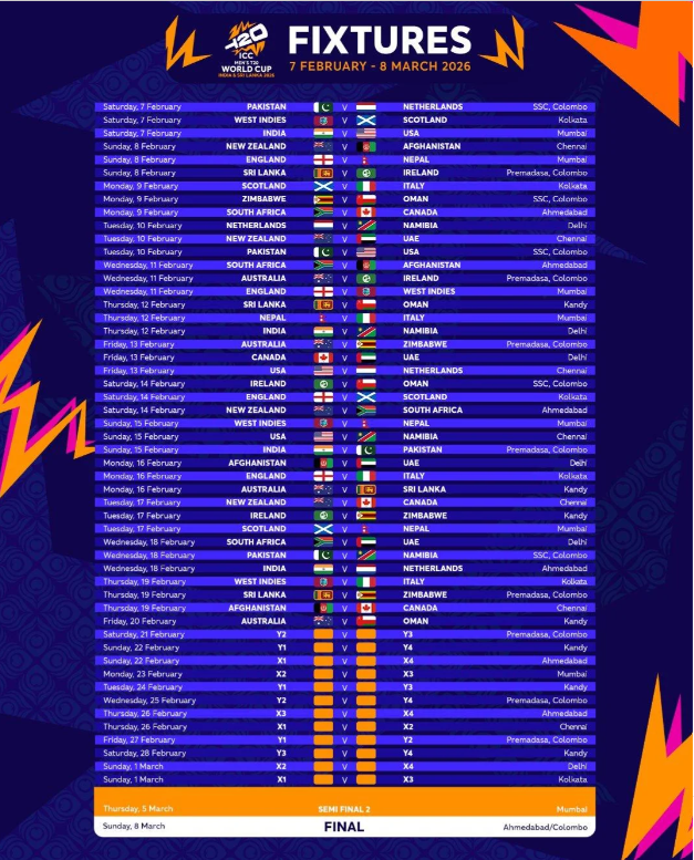 १३ माघ, काठमाडौं । आईसीसी पुरुष टी-२० विश्वकप २०२६ फेब्रुअरी ७ (माघ २४ गते) देखि सुरु हुँदैछ । सन् २००७ मा भारतबाट सुरु भएको टी-२० विश्वकपको यो १०औं संस्करण हो र टी-२० विश्वकप फेरि एक पटक दक्षिण एसियामा हुँदैछ ।