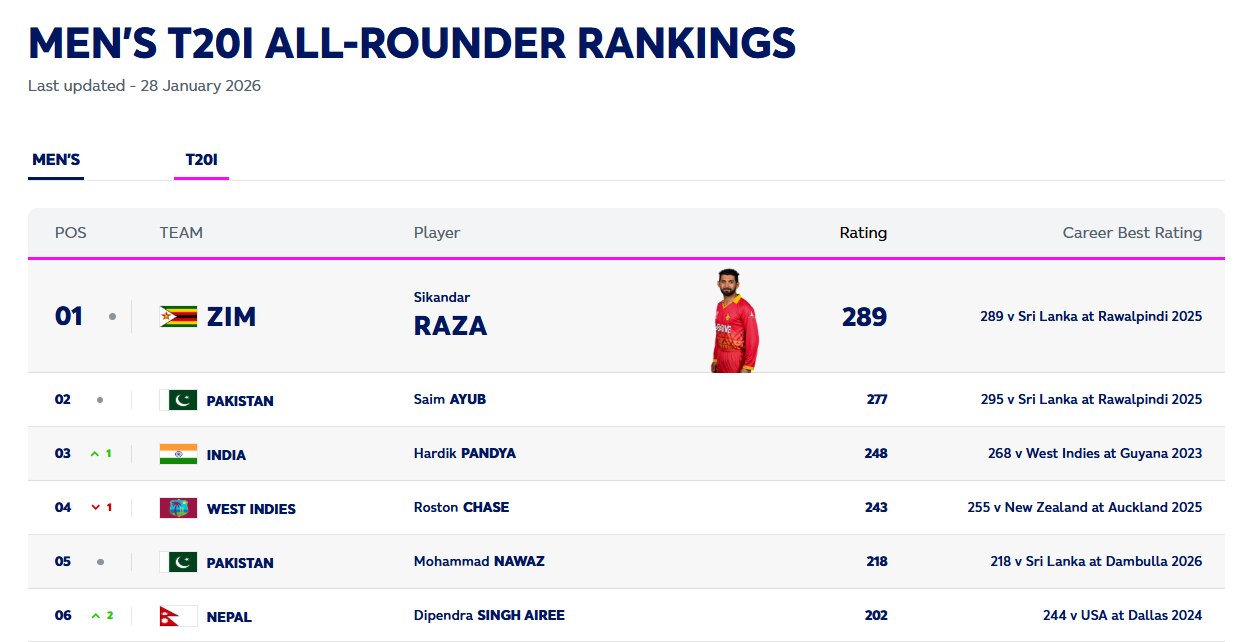 Generated by OK AI. Editorially reviewed.- नेपाली राष्ट्रिय क्रिकेट टोलीका अलराउन्डर दीपेन्द्रसिंह ऐरी आईसीसी टी-२०आई अलराउण्डर वरियतामा छैटौं स्थानमा यथावत् रहेका छन्।