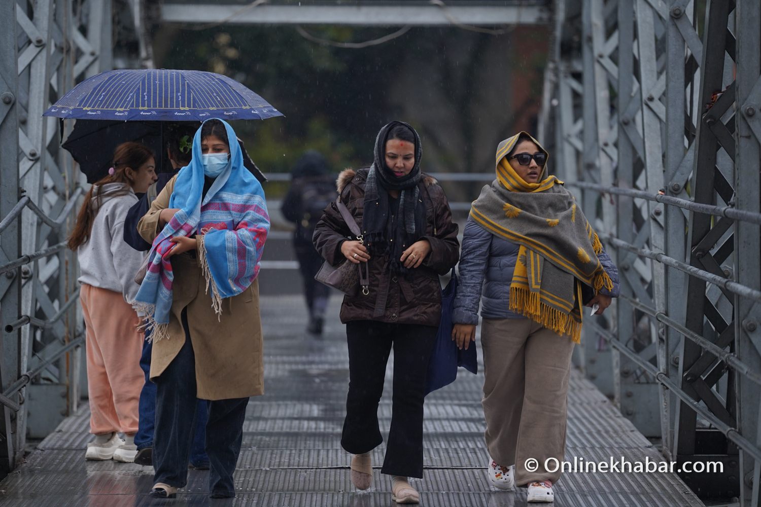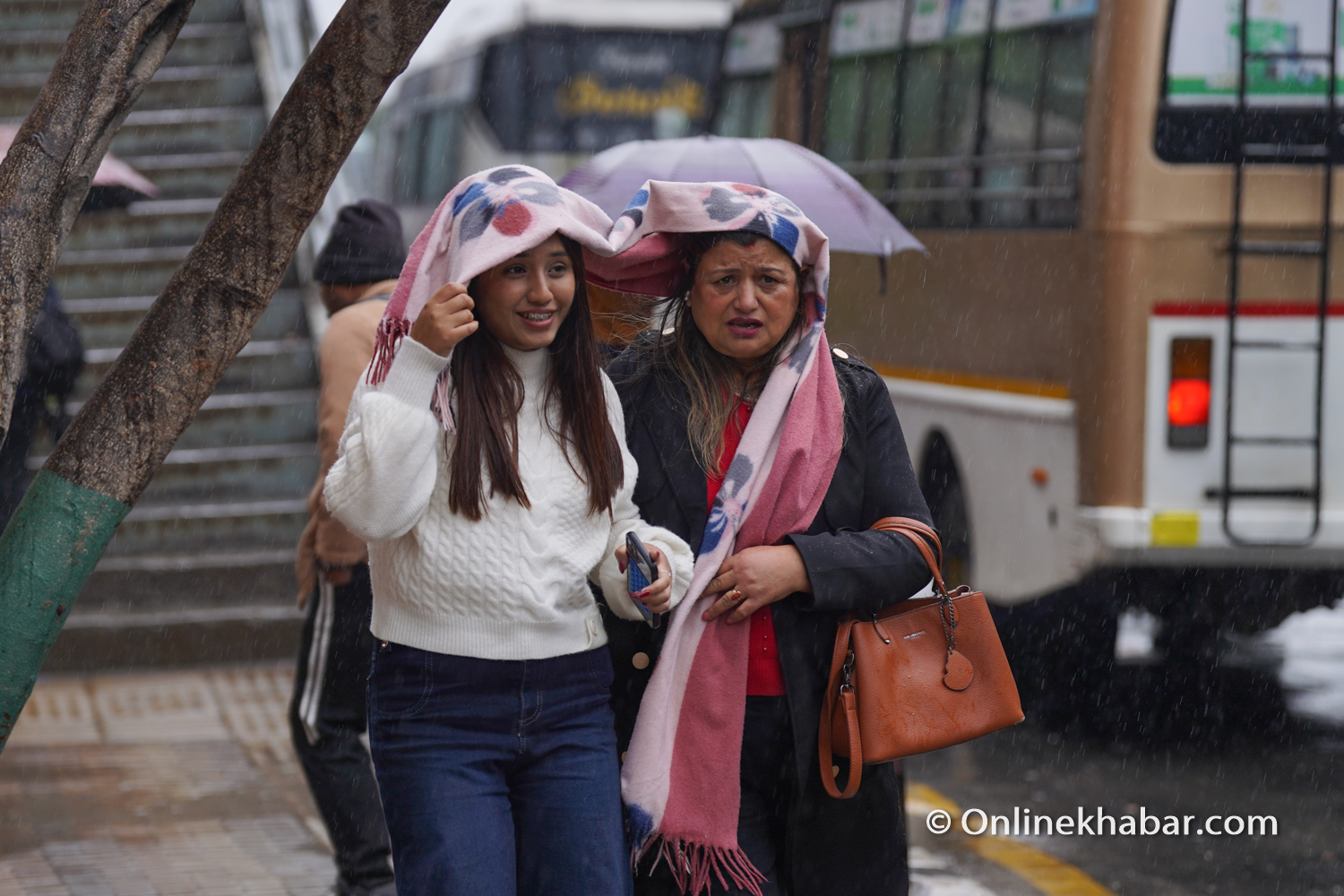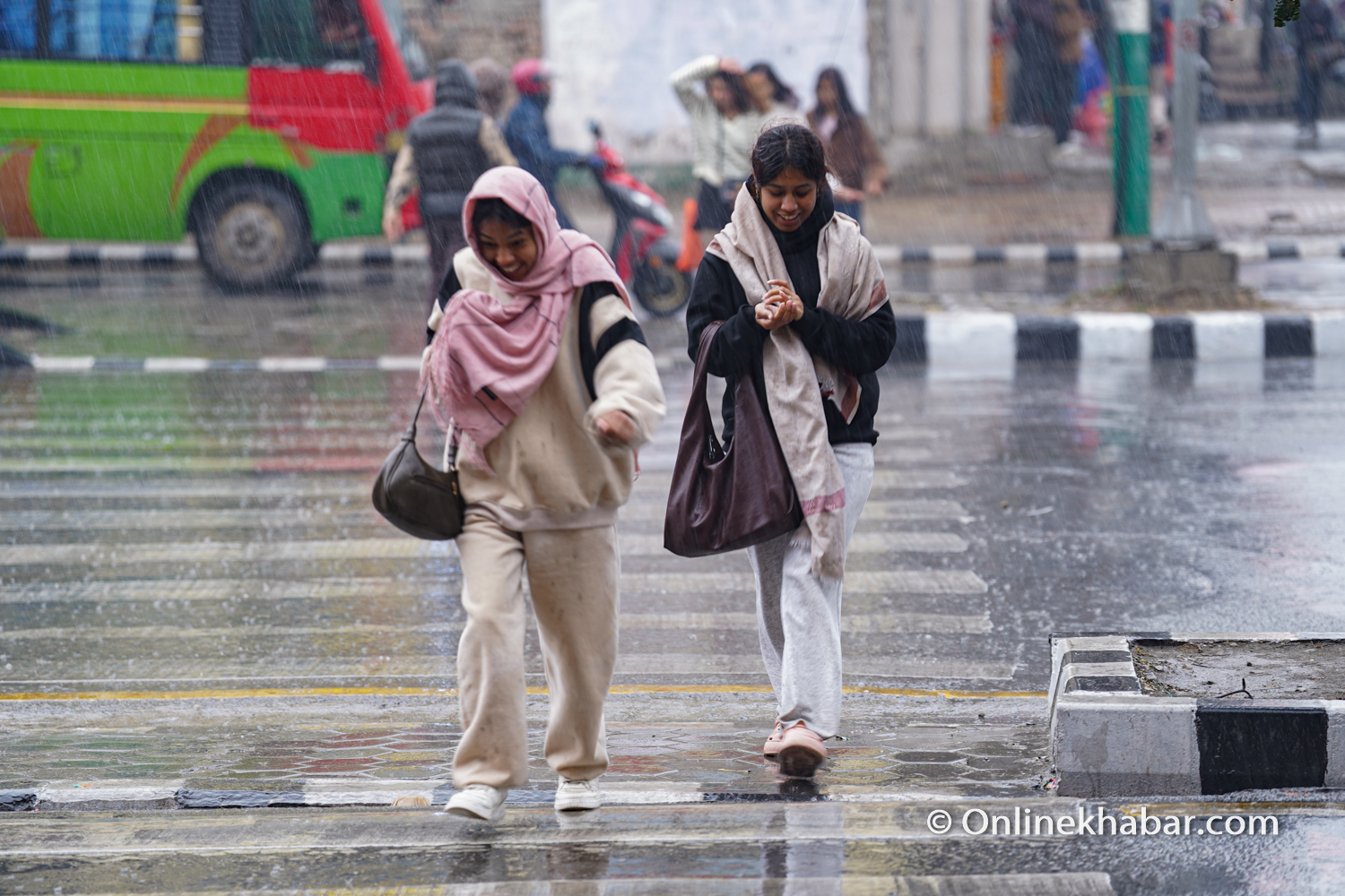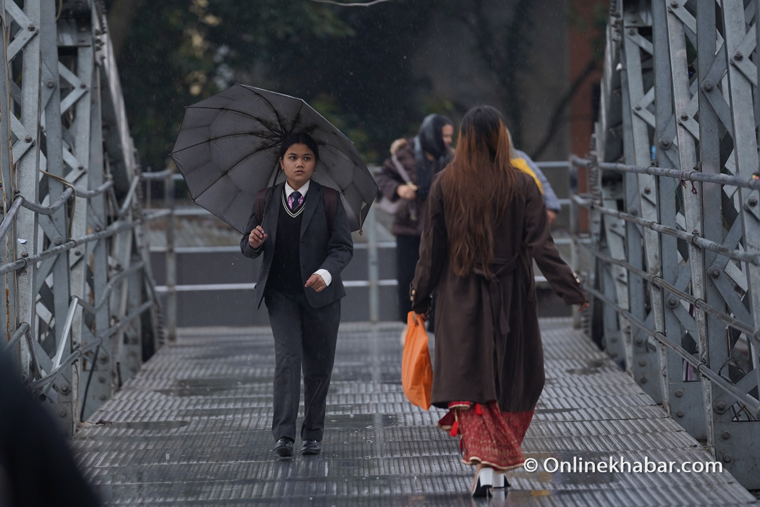 १४ माघ, काठमाडौं । पश्चिमी न्यून चापीय प्रणालीको प्रभावले काठमाडौं उपत्यकामा पनि वर्षा भएको छ ।