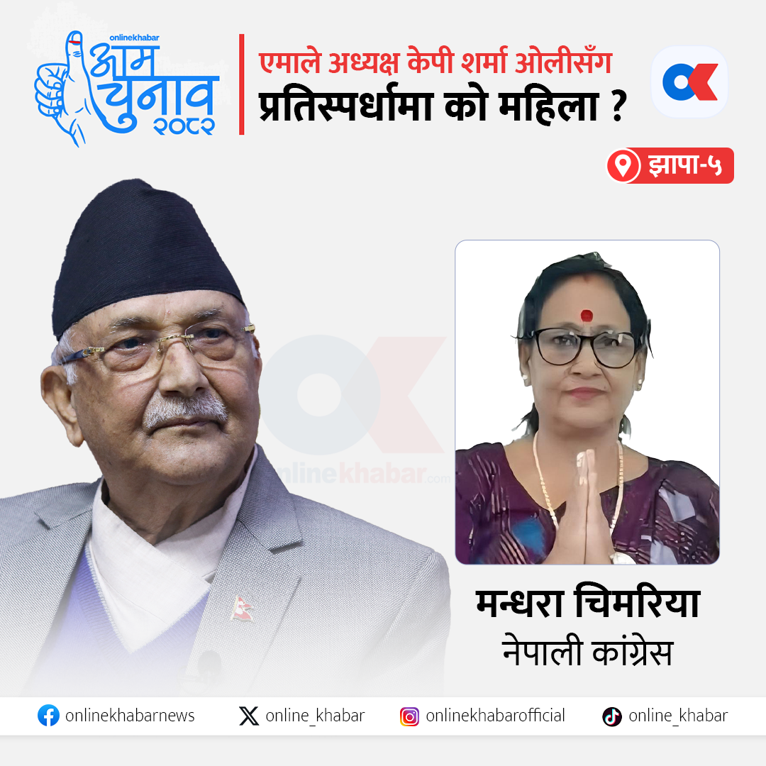 नेकपा एमालेका अध्यक्ष एवं पूर्वप्रधानमन्त्री केपी शर्मा ओली झापा–५ बाट चुनावी प्रतिष्पर्धामा छन् । यहाँ नेपाली कांग्रेसले मन्धरा चिमरियालाई उम्मेदवार बनाएको छ ।