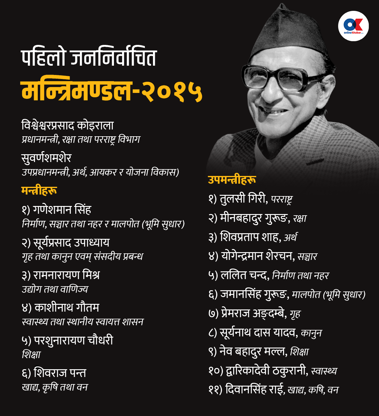 बीपी कोइरालालाई प्रधानमन्त्री नियुक्त गरेकै दिन राजाबाट १९ सदस्यीय मन्त्रिमण्डल घोषणा गरियो । भोलिपल्ट (जेठ १४) बसेको मन्त्रिमण्डल बैठकबाट प्रधानमन्त्री, मन्त्री र उपमन्त्रीहरूको कार्यविभाजन गरियो ।