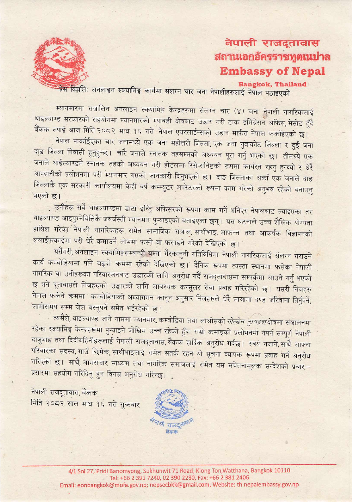 १६ माघ, काठमाडौं । म्यानमारमा सञ्चालित अनलाइन स्क्यामिङ केन्द्रहरूमा कार्यरत ४ नेपालीलाई स्वदेश फर्काइएको छ । ४ चार जना नेपालीलाई थाइल्याण्ड सरकारको सहयोगमा म्यानमारको म्यावडी क्षेत्रबाट उद्धार गरी आज शुक्रबार नेपाल फर्काइएको हो ।