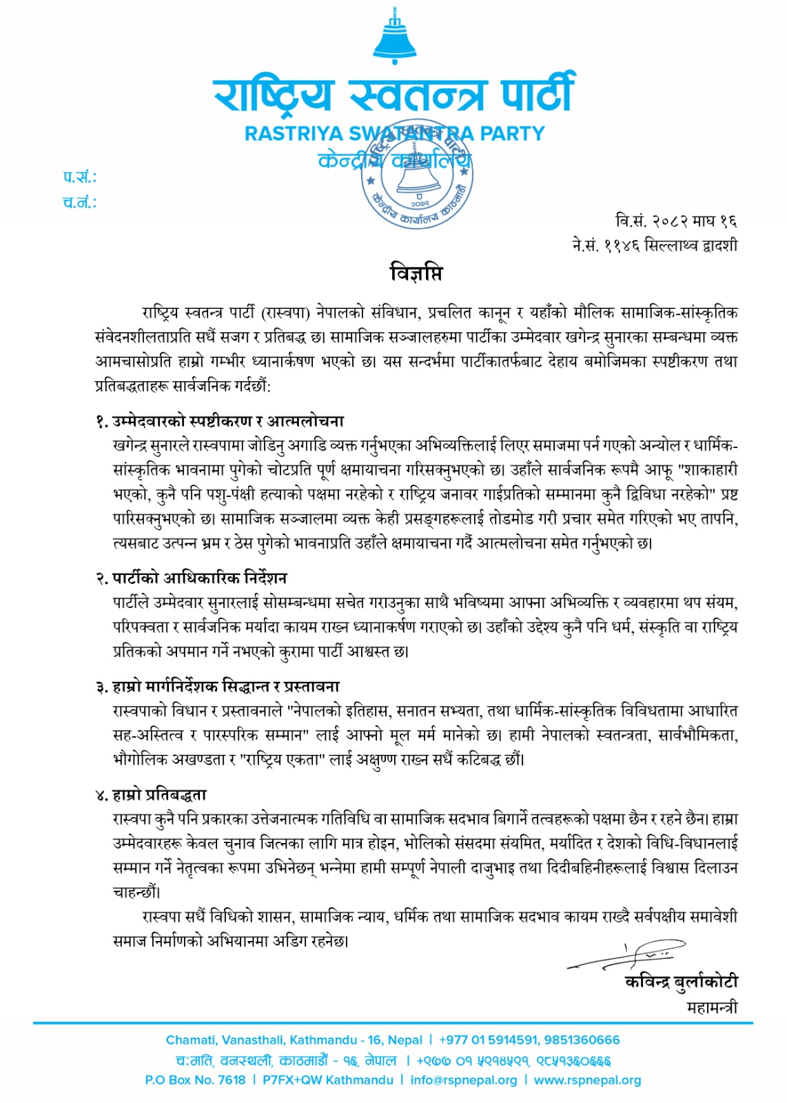 ‘खगेन्द्र सुनारले रास्वपामा जोडिनु अगाडि व्यक्त गर्नुभएका अभिव्यक्तिलाई लिएर समाजमा पर्न गएको अन्योल र धार्मिक–सांस्कृतिक भावनामा पुगेको चोटप्रति पूर्ण क्षमायाचना गरिसक्नुभएको छ । उहाँले सार्वजनिक रूपमै आफू “शाकाहारी भएको, कुनै पनि पशु–पंक्षी हत्याको पक्षमा नरहेको र राष्ट्रिय जनावर गाईप्रतिको सम्मानमा कुनै द्विविधा नरहेको“ प्रष्ट पारिसक्नुभएको छ,’ जारी विज्ञप्तिमा भनिएको छ, ‘सामाजिक सञ्जालमा व्यक्त केही प्रसङ्गहरूलाई तोडमोड गरी प्रचार समेत गरिएको भए तापनि, त्यसबाट उत्पन्न भ्रम र ठेस पुगेको भावनाप्रति उहाँले क्षमायाचना गर्दै आत्मलोचना समेत गर्नुभएको छ ।’