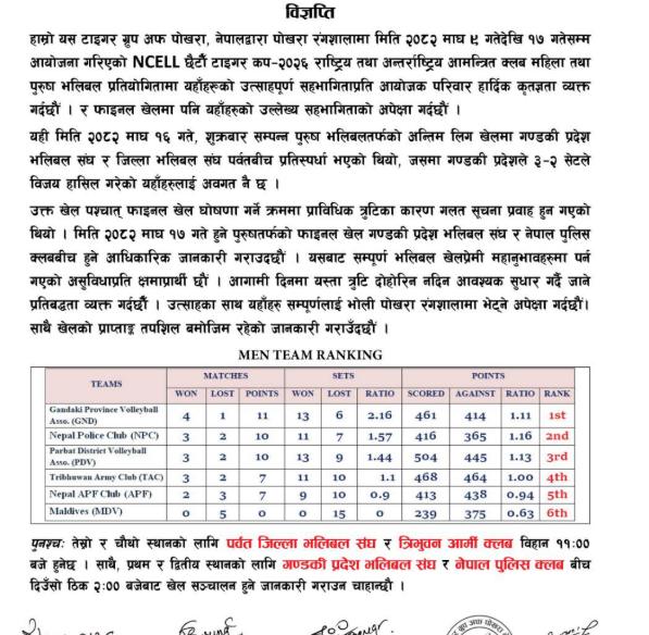 आयोजनक टाइगर ग्रुप अफ पोखरा नेपालले शुक्रबार राति प्रेस विज्ञप्ती जारी गर्दै सेट रेसियोमा पुलिस अगाडि भएको भन्दै फाइनलमा गण्डकी र पुलिसबिच प्रतिस्पर्धा हुने जानकारी गराएको हो । ‘फाइनल खेल घोषणा गर्ने क्रममा प्राविधिक त्रुटिका कारण गलत सूचना प्रवाह हुन गएको थियो । मिति २०८२ माघ १७ गते हुने पुरुषतर्फको फाइनल खेल गण्डकी प्रदेश भलिबल संघ र नेपाल पुलिस क्लबबीच हुने आधिकारिक जानकारी गराउदछौं,’ विज्ञप्तीमा भनिएको छ ।