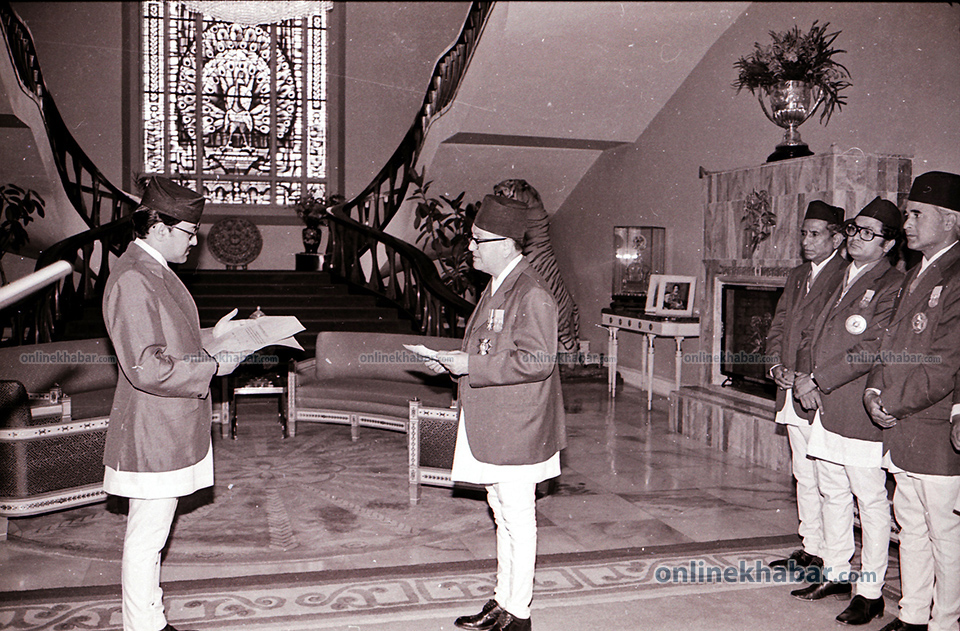 राजा वीरेन्द्रबाट सपथ ग्रहण गर्दै सूर्यबहादुर थापा