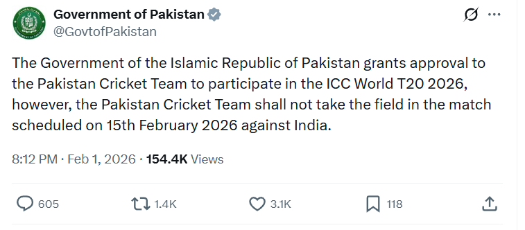 पाकिस्तान सरकारको आधिकारिक ‘एक्स’ (ट्विटर) खातामार्फत जारी भएको पोस्टमा पाकिस्तान टोलीलाई विश्वकप खेल्न श्रीलंका जान अनुमति दिइएको भए पनि १५ फेब्रुअरी २०२६ मा भारतसँग तय भएको खेलमा मैदानमा नउत्रिने स्पष्ट गरिएको छ।