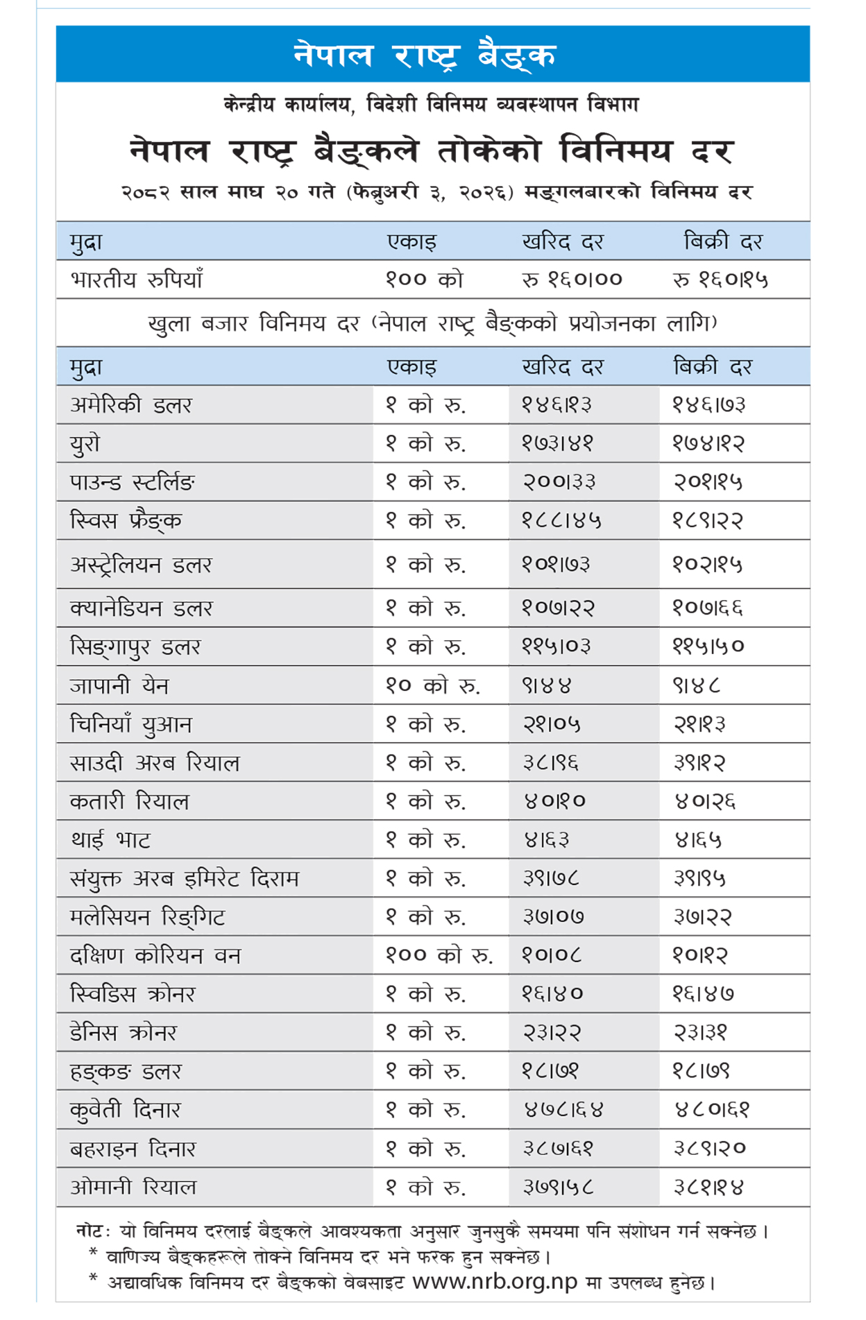 केन्द्रीय बैंकका अनुसार थाई भाट एकको खरिददर चार रुपैयाँ ६३ पैसा र बिक्रीदर चार रुपैयाँ ६५ पैसा, युएई दिराम एकको खरिददर ३९ रुपैयाँ ७८ पैसा र बिक्रीदर ३९ रुपैयाँ ९५ पैसा, मलेसियन रिङ्गेट एकको खरिददर ३७ रुपैयाँ ०७ पैसा र बिक्रीदर ३७ रुपैयाँ २२ पैसा, साउथ कोरियन वन १०० को खरिददर १० रुपैयाँ ०८ पैसा र बिक्रीदर १० रुपैयाँ १२ पैसा, स्वीडिस क्रोनर एकको खरिददर १६ रुपैयाँ ४० पैसा र बिक्रीदर १६ रुपैयाँ ४७ पैसा र डेनिस क्रोनर एकको खरिददर २३ रुपैयाँ २२ पैसा र बिक्रीदर २३ रुपैयाँ ३१ पैसा तोकिएको छ ।