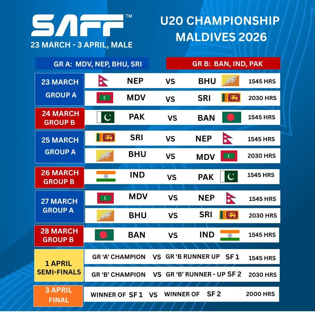 Generated by OK AI. Editorially reviewed.- नेपालले साफ यू-२० च्याम्पियनसिप २०२६ को पहिलो खेलमा मार्च २३ मा भुटानसँग खेल्नेछ।