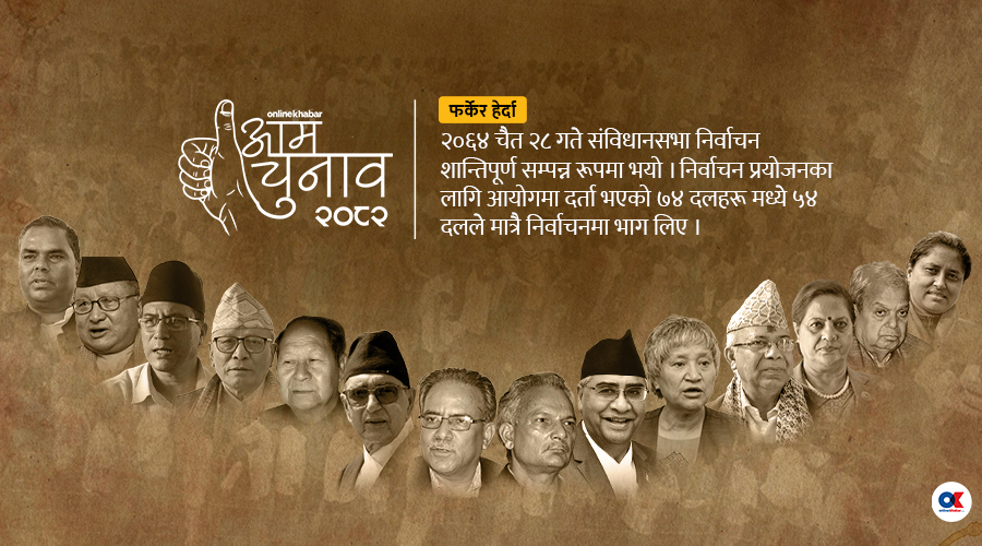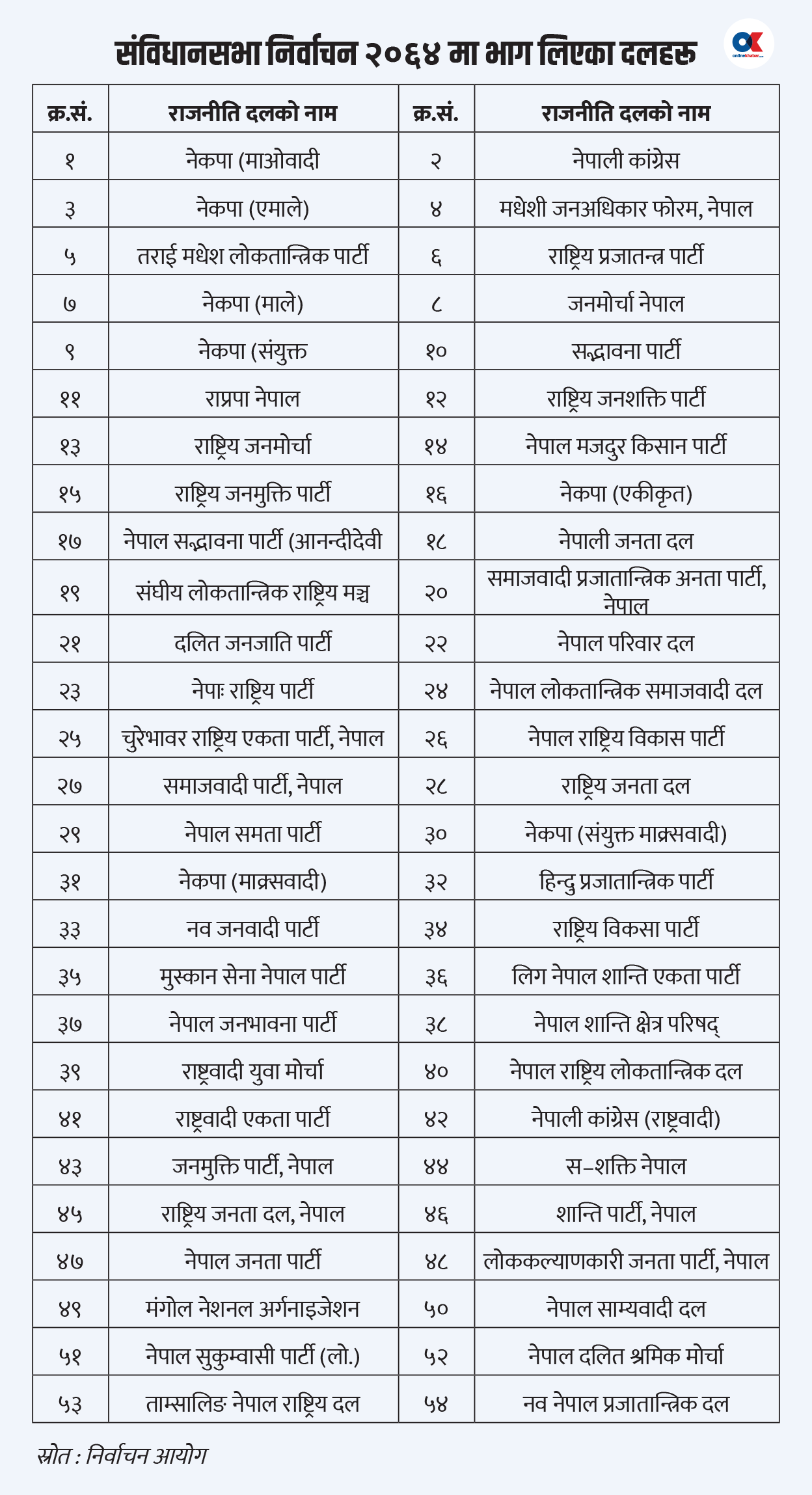 संविधानसभा निर्वाचन प्रयोजनका लागि ७४ राजनीतिक दलहरू निर्वाचन आयोगमा दर्ता भएका थिए । जसमध्ये ५४ दलले मात्रै संविधानसभा निर्वाचनमा भाग लिएका थिए ।