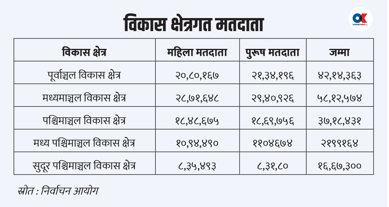 निर्वाचन आयोगका अनुसार संविधानसभा निर्वाचनमा मतदान गर्ने मतदाताको संख्या एक करोड ७६ लाख ११ हजार ८३२ पुगेको थियो ।