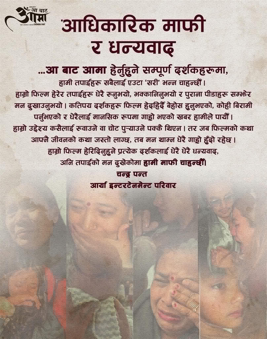 ‘हाम्रो उद्देश्य कसैलाई रुवाउने वा चोट पुर्याउने पक्कै थिएन । तर जब फिल्मको कथा जीवनको कथाजस्तो लाग्छ । तब मन थाम्न धेरै गाह्रो हुँदो रहेछ’ विज्ञप्तिमा भनिएको छ ।