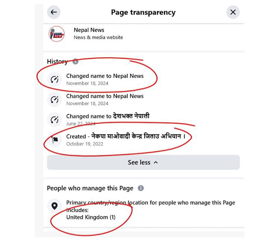 तर यो पेजको ट्रान्सपरेन्सी हेर्दा भने अक्टोबर १९, २०२२ मा नेकपा माओवादी केन्द्र जिताउ अभियान नामबाट सुरु भएको पेजलाई नोभेम्बर १८, २०२४ मा मात्र नेपाल न्युज नाममा परिवर्तन गरेको देखिएको र सामाजिक सञ्जालका प्रयोगकर्तालाई स्थापित अनलाइन न्युजपोर्टलको भ्रम दिन खोजेको देखियो।