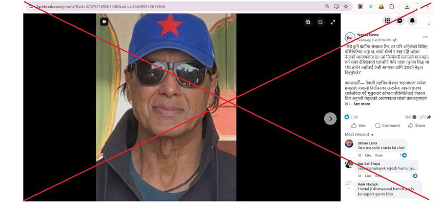 त्यसैगरी ‘नेपाल न्युज’ नामक फेसबुक पेजले पनि राजेश हमालको सोही फोटो राख्दै नेकपा र नेकपाका संयोजक पुष्पकमल दाहाल प्रचण्डको पक्षमा मत मागेको दाबी गरेको छ। ‘नेपाल न्युज’ले फेसबुकमा राखेको उक्त पोस्टमा हामीले तथ्य जाँच गर्दै गर्दा दुई हजार दुई सय लाइक, तीन सय ६० कमेन्ट र दुई सय ७७ पटक शेयर गरिरहेको छ ।
