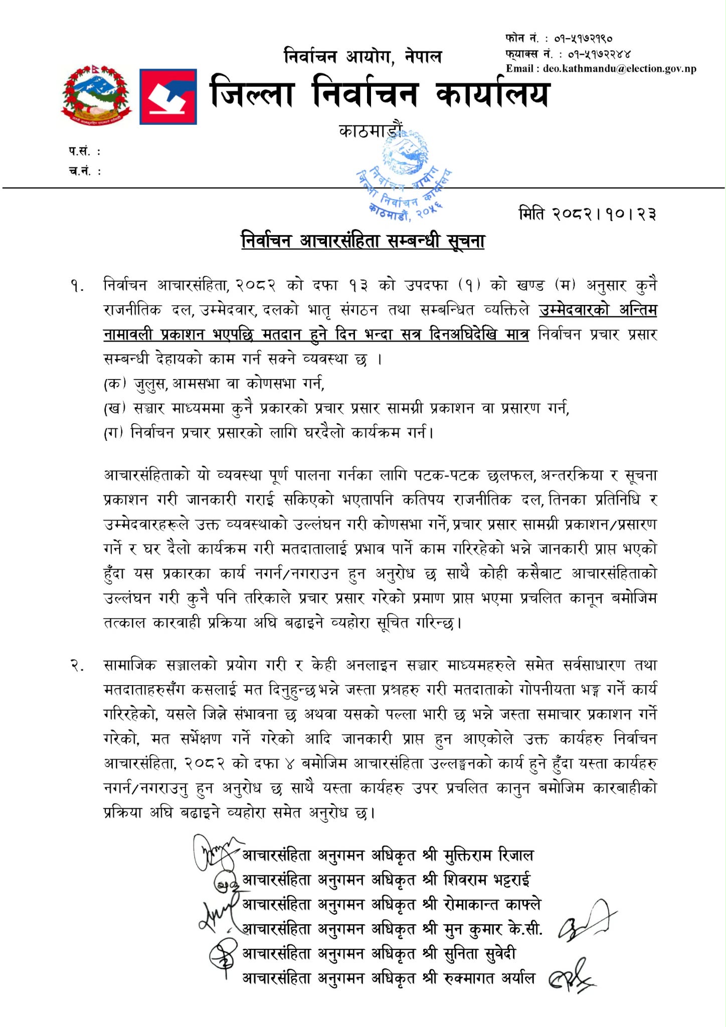 निर्वाचन आचारसंहिता, २०८२ को दफा ४ बमोजिम आचारसंहित उल्लंघन हुने कार्य नगर्न निर्वाचन कार्यालयले सचेत गराएको हो ।