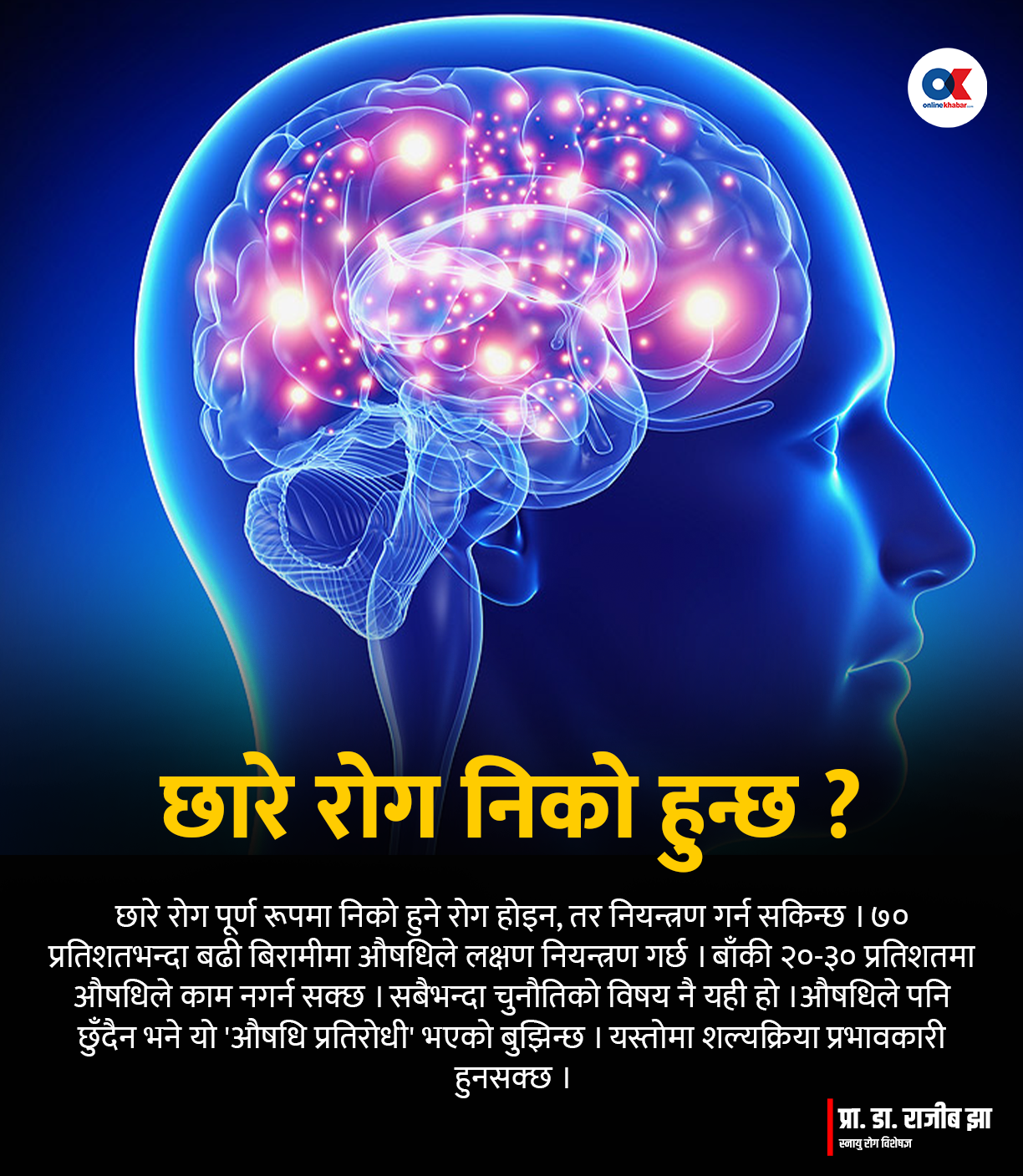 तर, मस्तिष्कका नसाहरू कुनै कारणवस चाहिनेभन्दा बढी सक्रिय भई एक किसिमको ‘करेन्ट’ प्रवाह हुन्छ, त्यसलाई छारे रोग भनिन्छ ।