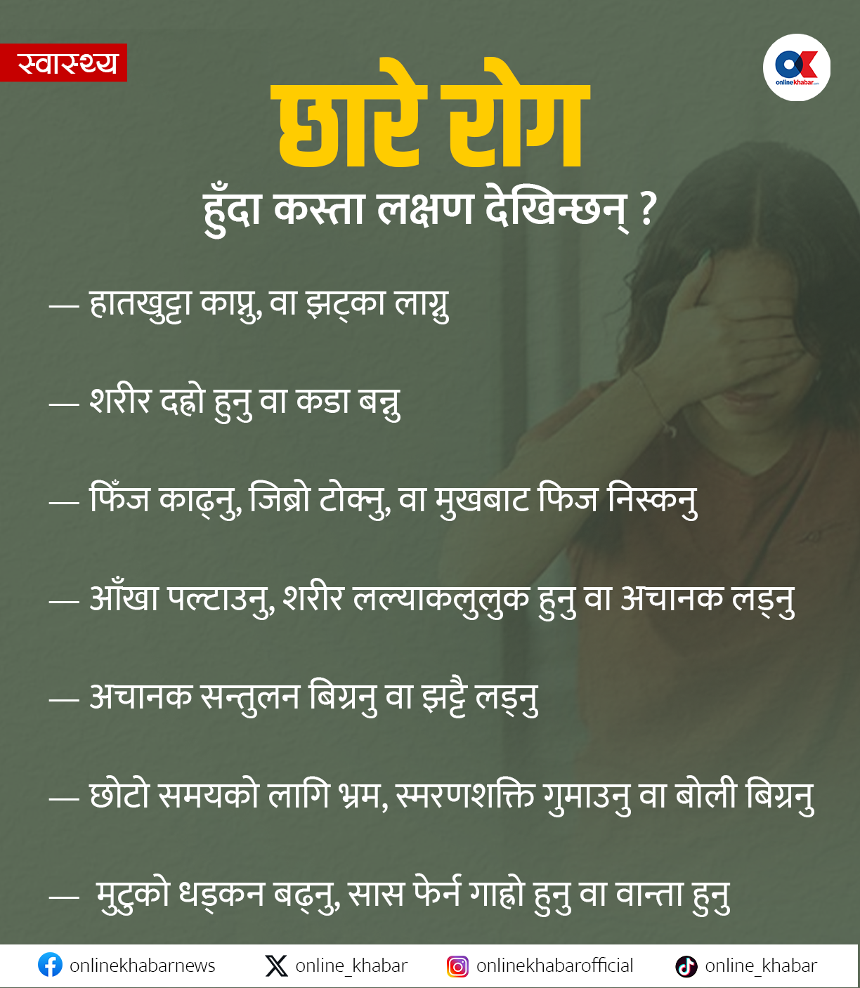 मस्तिष्कबाट पैदा हुने यो स्नायुरोग हुँदा अचानक मुटु काँपेको जस्तो हुन्छ, एक किसिमको झट्का लाग्छ, शरीरमा पूरै कम्पन आएर लडिएलाजस्तो हुन्छ, यी लक्षण कतिखेर कसरी आउँछ, पत्तो हुँदैन । यस्तो अवस्थामा दैनिकी नै तनावग्रस्त बनाउँछ ।