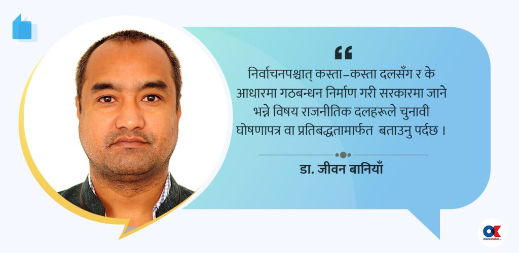 त्यसैले निर्वाचनपश्चात् कस्ता–कस्ता दलसँग र के आधारमा गठबन्धन निर्माण गरी सरकारमा जाने भन्ने विषय राजनीतिक दलहरूले चुनावी घोषणापत्र वा प्रतिबद्धतामार्फत बताउनु पर्दछ ।