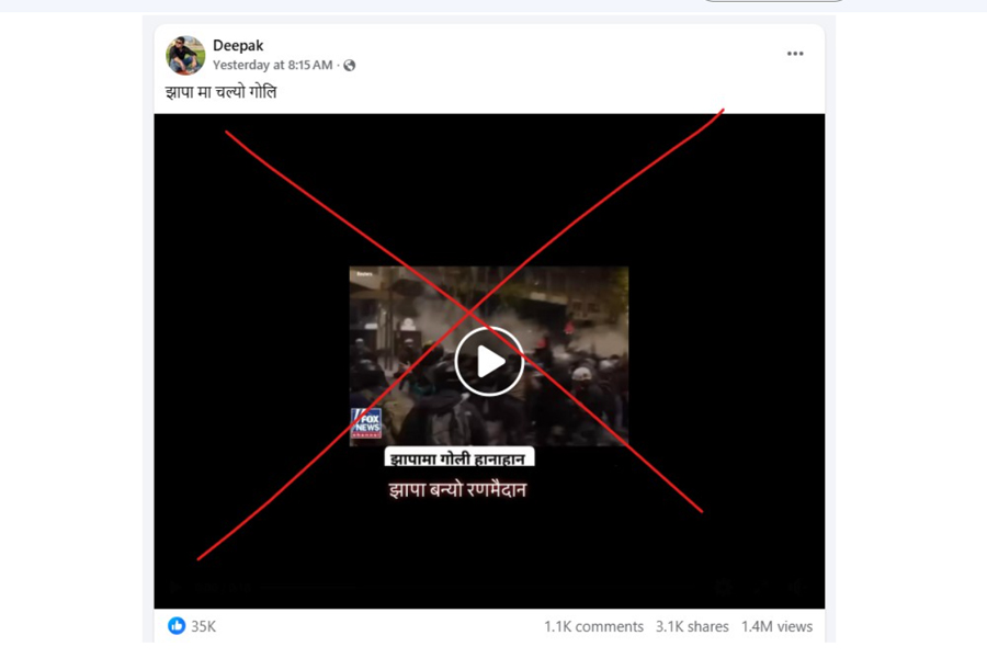 ७३ हजार फलोअर भएका दीपक (Deepak) नामक फेसबुक प्रयोगकर्ताले बुधबार (फेब्रुअरी ११) बिहान ८ : १५ बजे आफ्नो फेसबुक पेजमा एउटा भिडियो राखे। ‘झापामा चल्यो गोली’ शीर्षकसहित उक्त फेसबुक पेजमा अपलोड गरिएको भिडियोमा लेखिएको छ, ‘झापामा गोली हानाहान, झापा बन्यो रणमैदान’