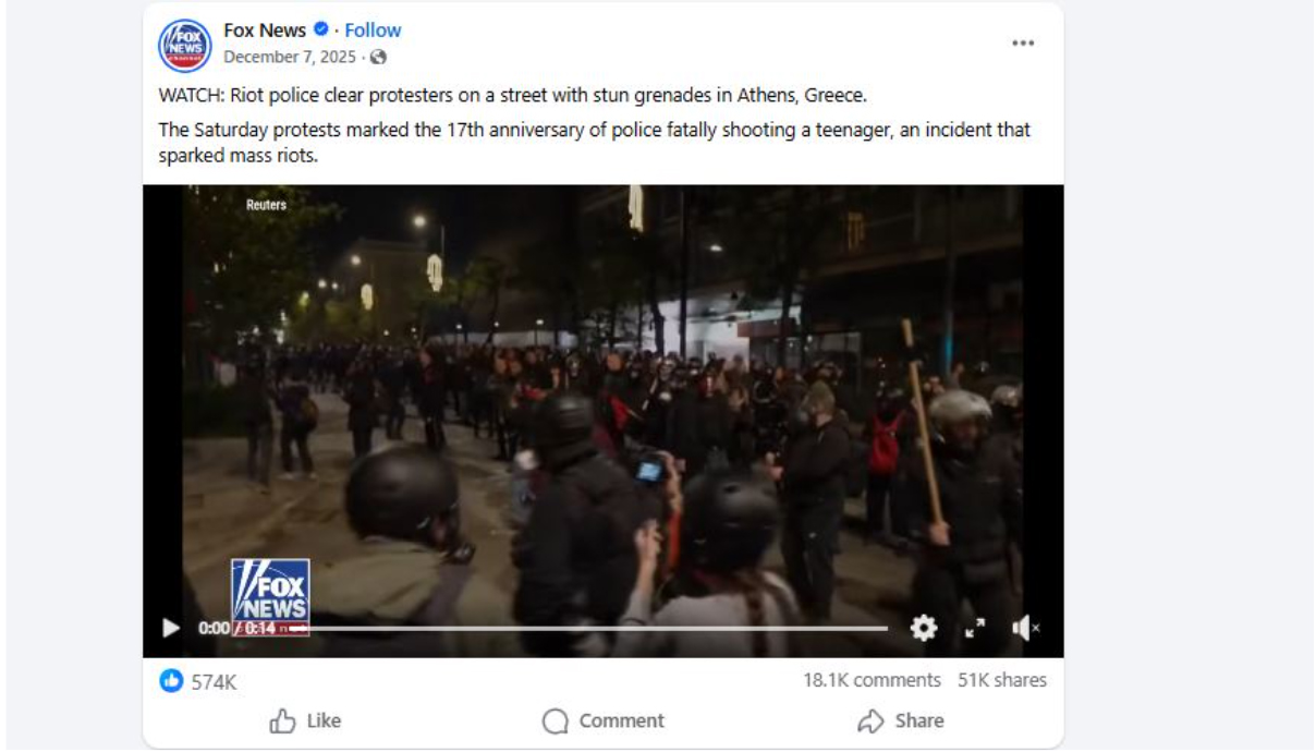 हामीले भाइरल भिडियोबाट स्क्रिनसट लिएर गुगलमा रिभर्स इमेज सर्च गर्यौँ। खोज्ने क्रममा फक्स न्यूजले आफ्नो आधिकारिक फेसबुक पेजमा सन् २०२५ डिसेम्बर ७ मा बिहान ७ः५९ मा उक्त भिडियो अपलोड गरेको फेला पार्यौँ। त्यसमा भिडियो ग्रीसको एथेन्समा भएको एक सडक प्रदर्शनको भएको उल्लेख गरिएको छ ।