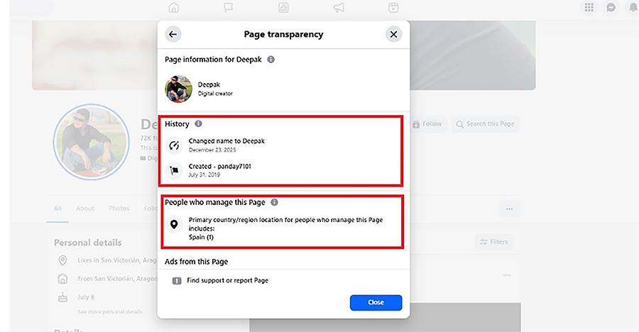 हामीले तथ्य जाँच गर्ने क्रममा उक्त भिडियो अपलोड गर्ने फेसबुक पेज स्पेनबाट सञ्चालन भएका पाइयो। सन् २०१९ जुलाई ३१ मा panday7101 नाम राखेर खोलिएको उक्त फेसबुक पेजको सन् २०२५ डिसेम्बर २३ मा नाम परिवर्तन गरेर दीपक (Deepak) बनाइएको पेज ट्रान्सपरेन्सीले देखाउँछ ।