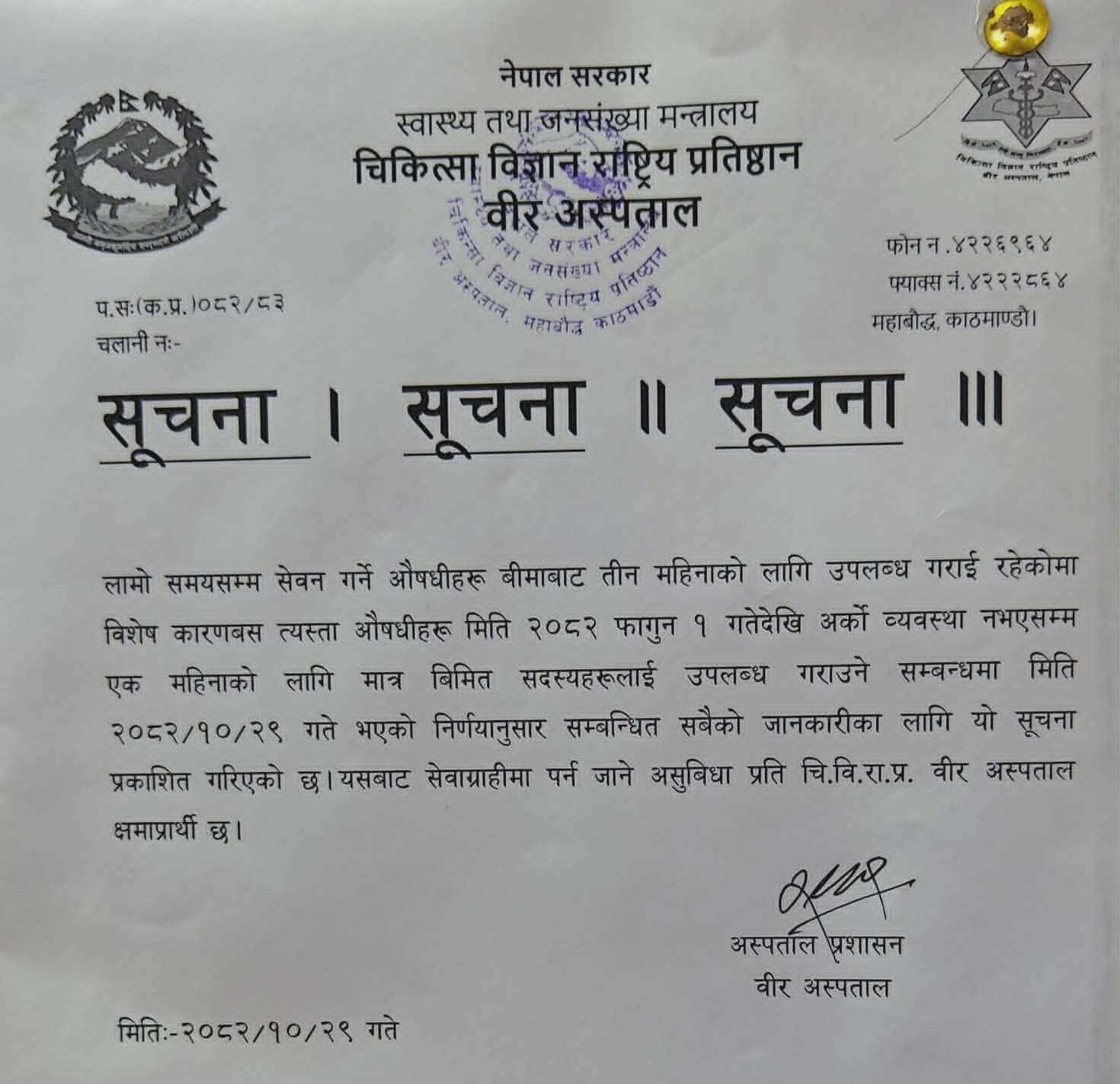 Generated by OK AI. Editorially reviewed.- वीर अस्पतालले स्वास्थ्य बीमाबाट उपलब्ध हुने औषधि सेवा कटौती गर्दै एकपटकमा एक महिनासम्म मात्र औषधि उपलब्ध गराउने निर्णय गरेको छ।