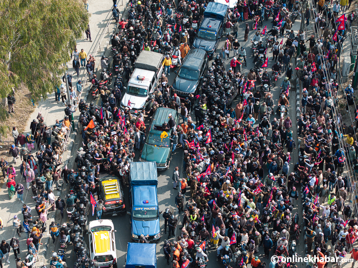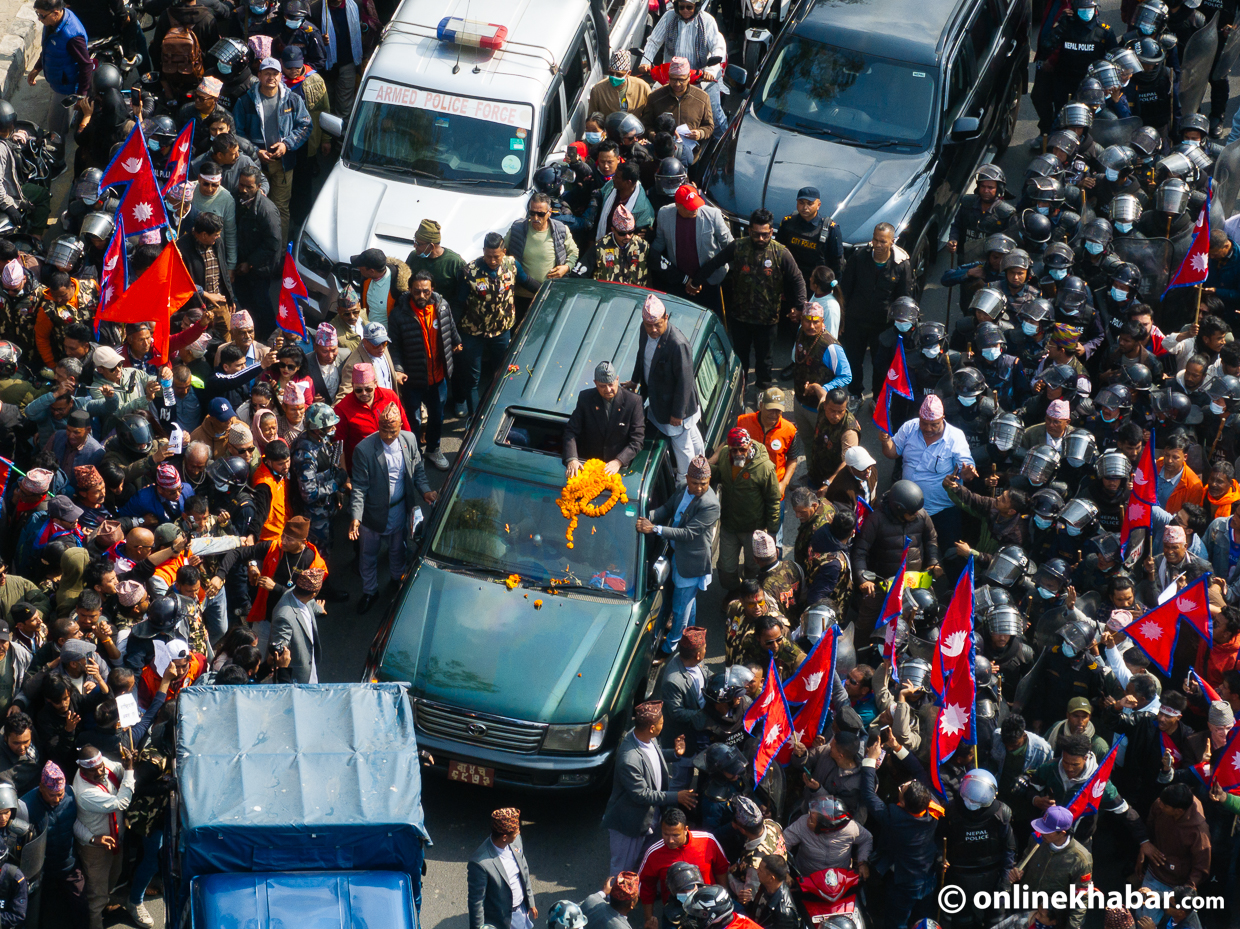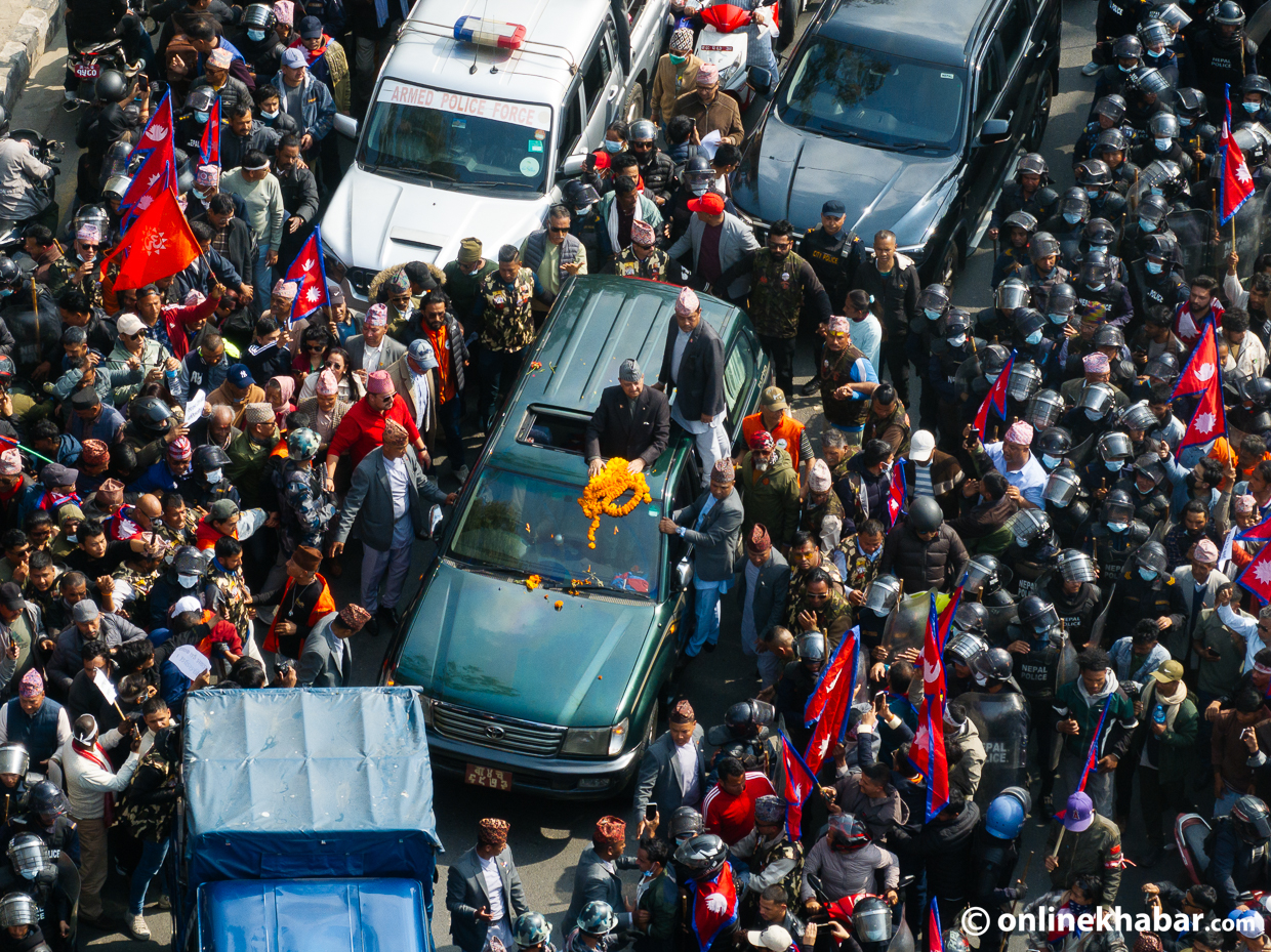समर्थकबाट घेरिँदै निर्मल निवास पुगे ज्ञानेन्द्र (फोटो/भिडियो)