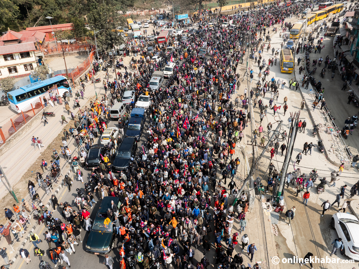 झापाबाट त्रिभुवन अन्तराष्ट्रिय विमानस्थल ओर्लेका शाहलाई उनका हजारौं समर्थकले नाराजुलुस गर्दै निर्मल निवास पुर्‍याएका हुन् । उनको स्वागतमा ठूलो संख्यामा समर्थकहरू विमानस्थल अगाडि पुगेका थिए । त्यहाँबाट नाराजुलुस गर्दै चक्रपथको बाटो निर्मल निवास लगिएको थियो ।