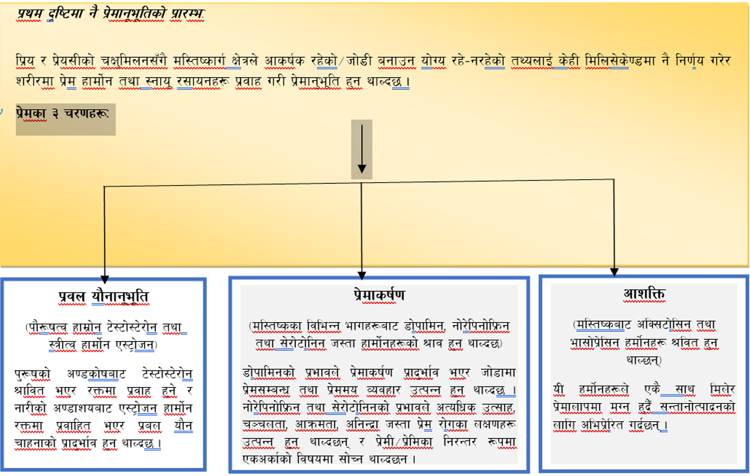 यौवनको आगमनसँगै प्रकृतिले एउटा प्रजातिलाई क्रियाशील, जीवन्त तथा सन्तान उत्पादनद्वारा दीर्घजीविता प्रदान गर्नका लागि प्रेमाआशक्त बनाउने आफ्नो महा–योजनाअन्तर्गत शरीर तथा मस्तिष्कबाट प्रवाहित केही रसायनहरूको ताण्डव नृत्यबाट प्रेमरूपी नृत्यमा हामीलाई नर्तक/नर्तकी जस्तै नचाइरहेको हुन्छ । पे्रयसी/प्रेमी सँगको आँखा जुधाइसँगै हाम्रो मस्तिष्कका विभिन्न भागहरू एक साथ सक्रिय भएर थरीथरीका रसायन तथा हर्मोनहरू उत्सर्जित भएर ०.२ सेकेण्डमा नै प्रेमानुभूतिले गर्दा विभिन्न परिवर्तनहरू आउन थाल्दछन् । प्रेमाशक्त हुने बित्तिकै ‘स्वचालित स्नायूप्रणाली’ सक्रिय भएर रक्त प्रवाह बढ्न गई मुहार रक्तिम तथा आँखाहरू लट्ठ हुन जान्छन् तथा उत्तेजनाले गर्दा श्वास–प्रश्वास प्रणाली तीव्र हुन जान्छ ।