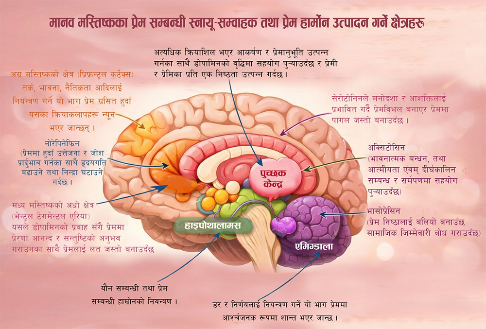 मस्तिष्कमा निहित बदाम जस्तो आकारको एउटा संरचना रहन्छ, जसलाई हामी एमिग्डाला भन्दछौंं । यो अङ्ग विशेषत: मानवको भावना, डर र स्मृतिसँग जोडिएको हुन्छ । यो शरीरको एउटा अलार्म प्रणाली जस्तै हो, जसले खतराबाट मानवलाई बचाउने प्रयास गर्दछ । तर पे्रमाशक्तिसँगै मस्तिष्कको यो भाग आश्चर्यजनक रूपले शान्त भएर जान्छ र सम्पूर्ण खतरा तथा सामाजिक परिवेशलाई उल्लङ्घन् गर्न पनि तत्पर हुन जान्छ । ‘प्रेम अन्धो हुन्छ’ भन्ने तथ्य स्नायूविज्ञानले पनि प्रष्ट पार्दछ ।