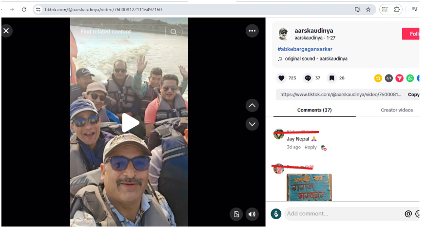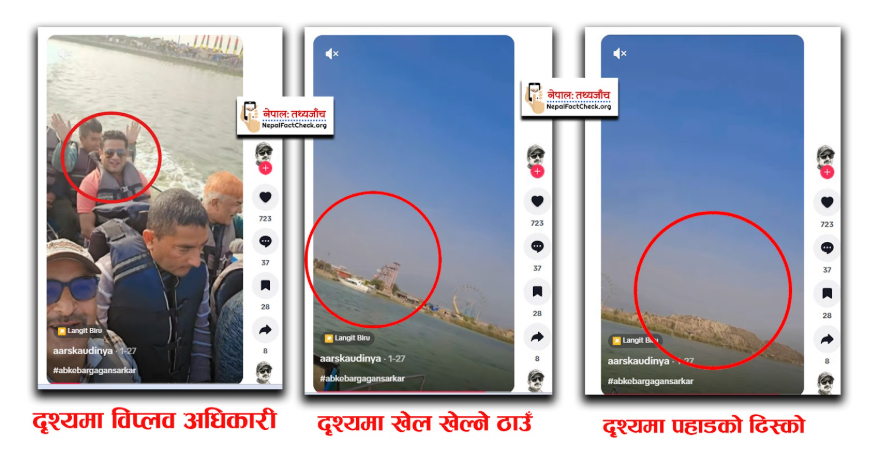 भिडियोको ‍ब्याकग्राउन्डमा केही खेल्ने ठाउँ र तालको किनारमा ढिस्को देखिन्छ । डुंगामा रहेका व्यक्तिहरुको पहिचानका लागि हामीले प्रयास गर्‍यौं । यस क्रममा ‘अबकी बार’ नारा लगाउने व्यक्ति नेपाल औषधि उत्पादक संघका अध्यक्ष विप्लव अधिकारी रहेको पहिचान भयो ।