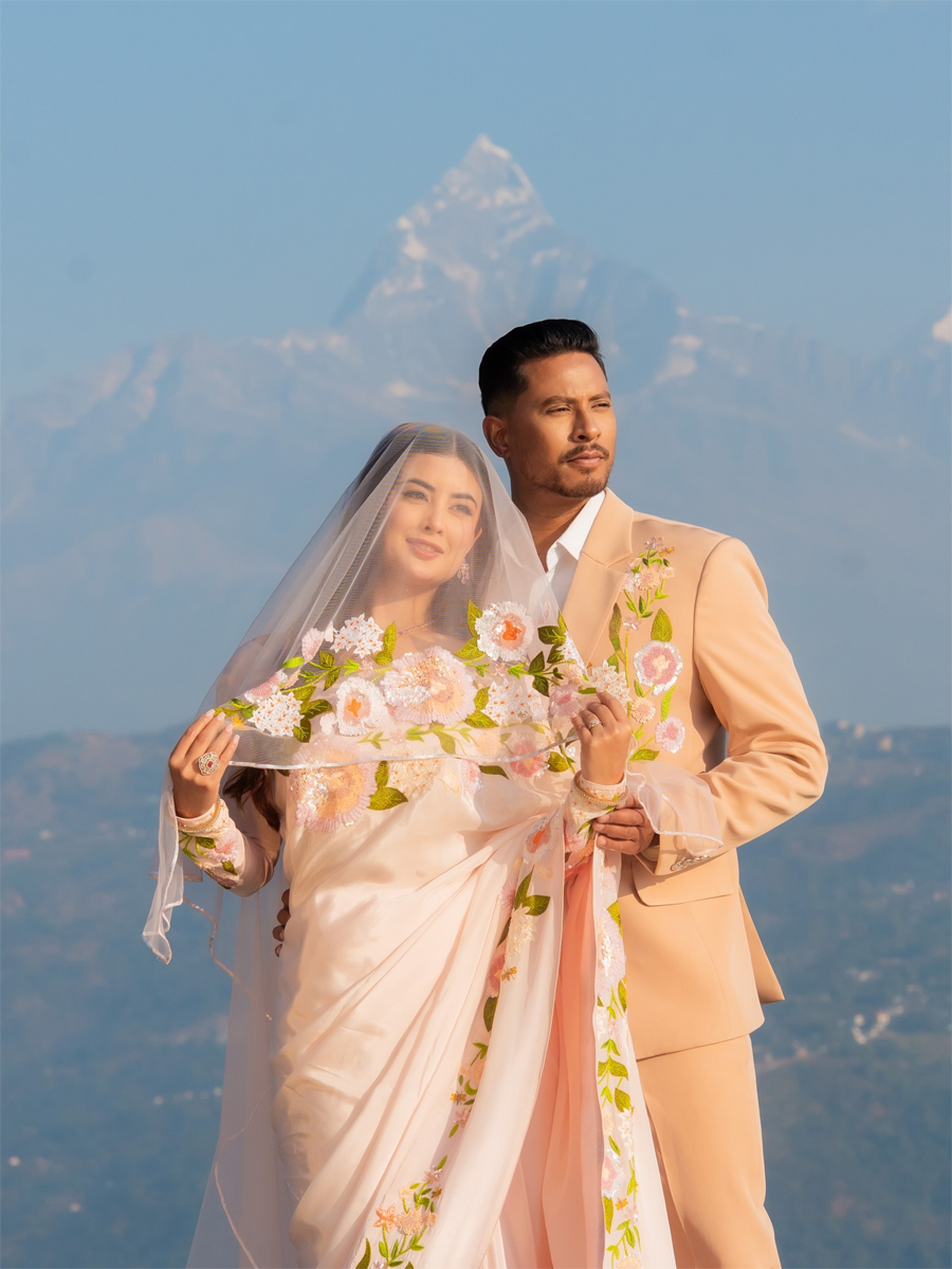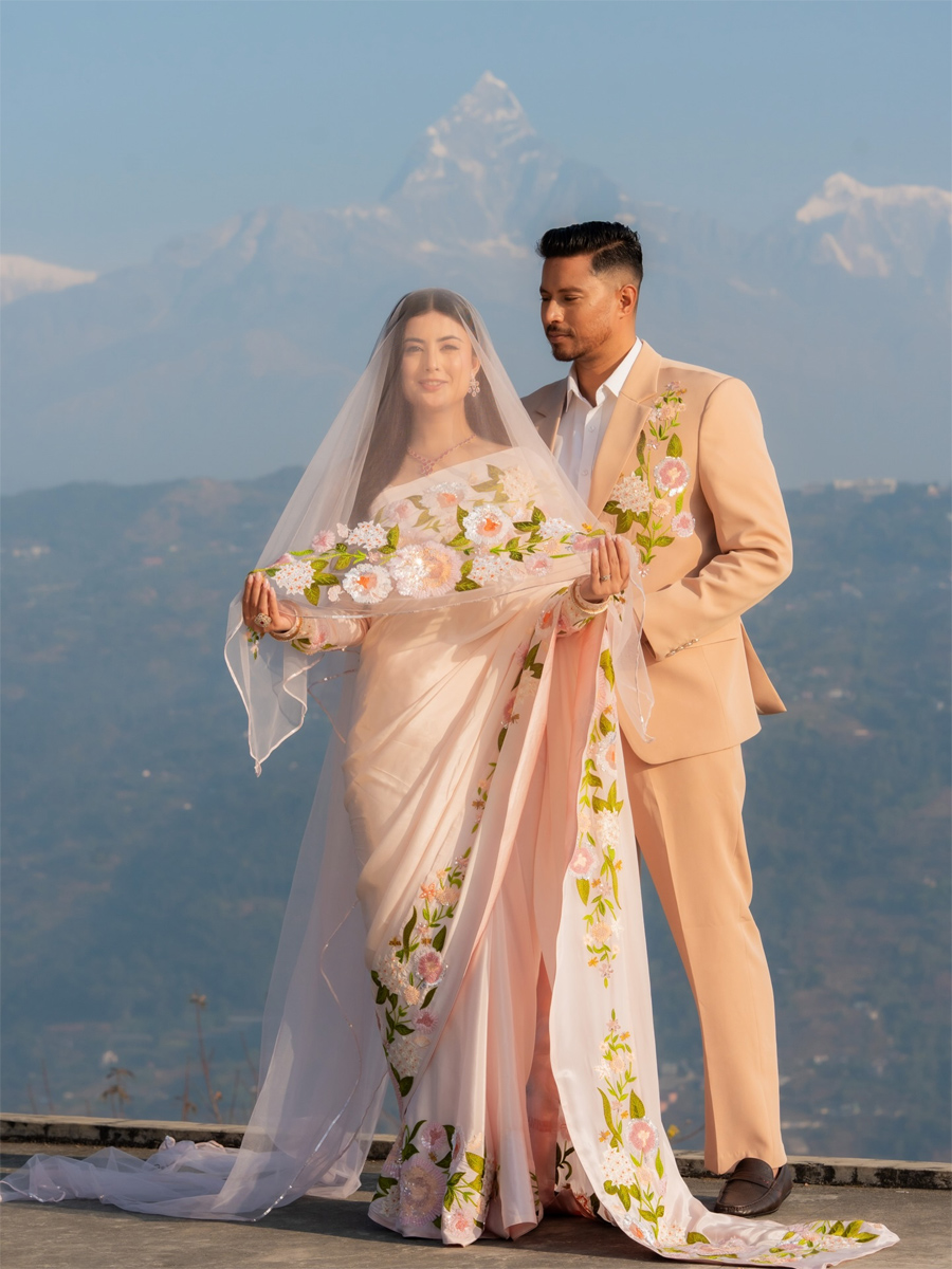 नीति ब्लस पीची पिंक साडीमा देखिएकी छन्, जसमा डेलिकेट रोमान्स र उत्कृष्ट शिल्प झल्किन्छ । पल्लु र हेम जडित फूलका बुट्टाहरूले साडीलाई सौन्दर्य दिएका छन् ।