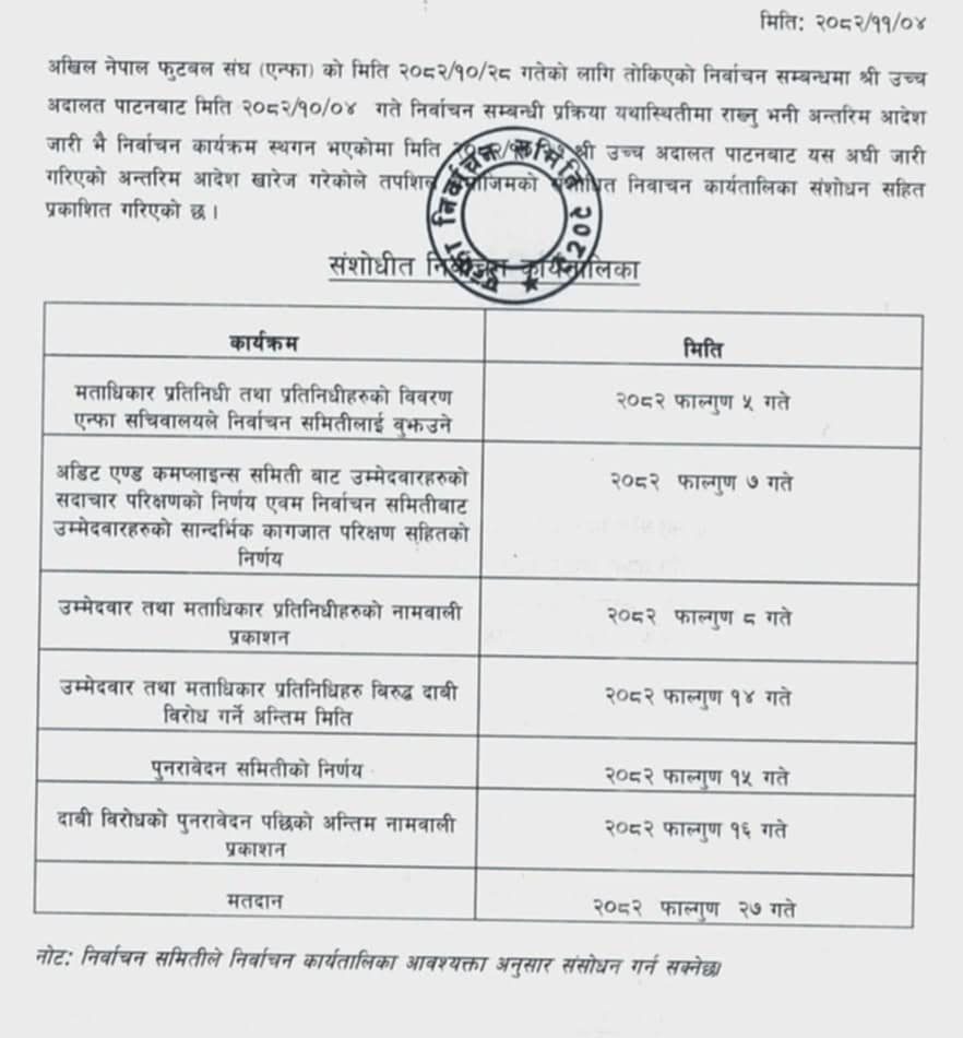 • अखिल नेपाल फुटबल संघको निर्वाचनका लागि संशोधित कार्यतालिका सार्वजनिक भएको छ।