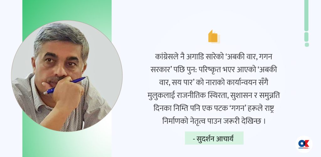 कांग्रेसले नै अगाडि सारेको ‘अबकी वार, गगन सरकार’ पछि पुन: परिष्कृत भएर आएको ‘अबकी वार, सय पार’ को नाराको कार्यान्वयन सँगै मुलुकलाई राजनीतिक स्थिरता, सुशासन र समुन्नति दिनका निम्ति पनि एक पटक ‘गगन’ हरूले राष्ट्र निर्माणको नेतृत्व पाउन जरूरी देखिन्छ ।