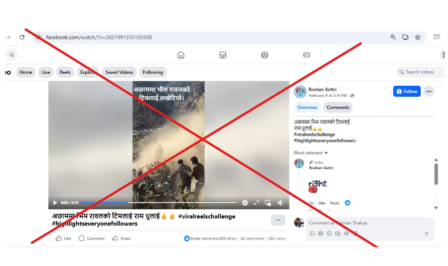 नेकपा एमालेको समर्थनमा निरन्तर फेसबुक पोष्ट सार्वजनिक गरिरहने लक्ष्मण धामी नाम गरेका ३६ हजार फलोअर्स रहेको फेसबुक प्रयोगकर्ताले फेब्रुअरी ८ को दिन अछाममा भीम रावल लखेटिएको दाबीसहितको १० सेकेन्डको भिडियो सार्वजनिक गरेका छन् ।
