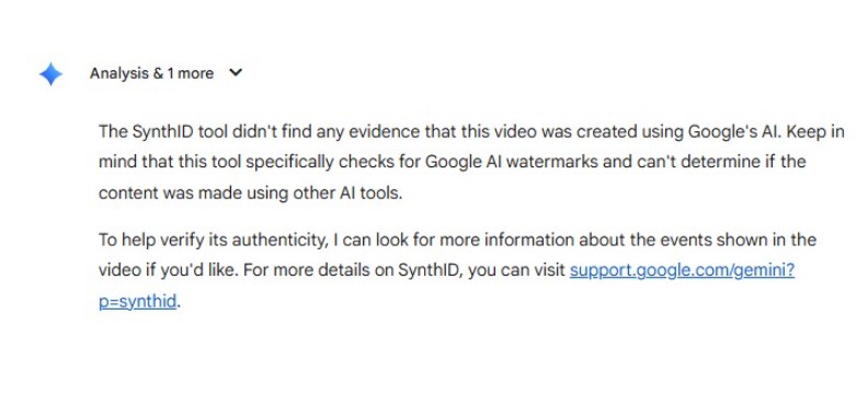 त्यसपछि हामीले यो भिडियो एआईमार्फत बनेको हो कि होइन भनेर जाँच गरेर हेर्यौँ । गुगलको synth ID परीक्षण गर्दा नतिजामा यो भिडियोमा एआईको प्रयोग नगरिएको देखियो ।