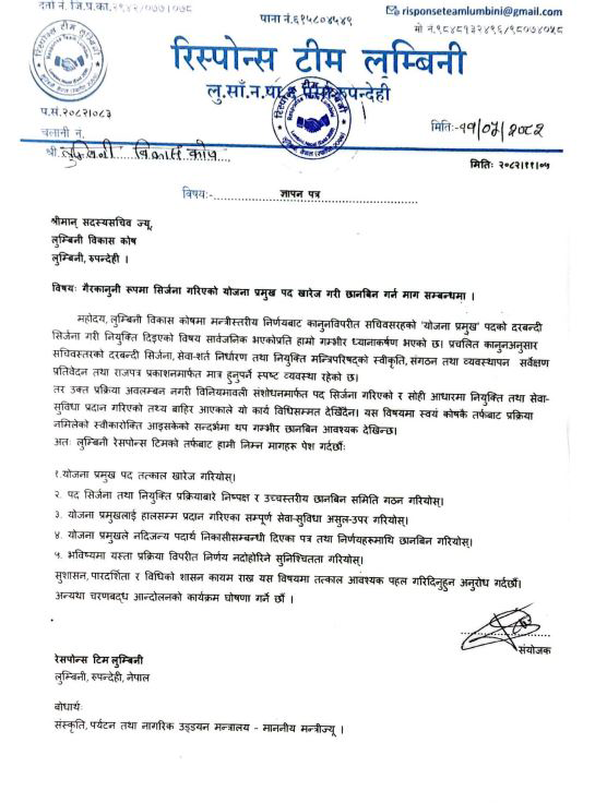 रेस्पोन्स टिम लुम्बिनीले कोषका सदस्य सचिव दीपक श्रेष्ठलाई मंगलबार ज्ञापनपत्र बुझाउँदै यस्तो माग गरेको हो ।