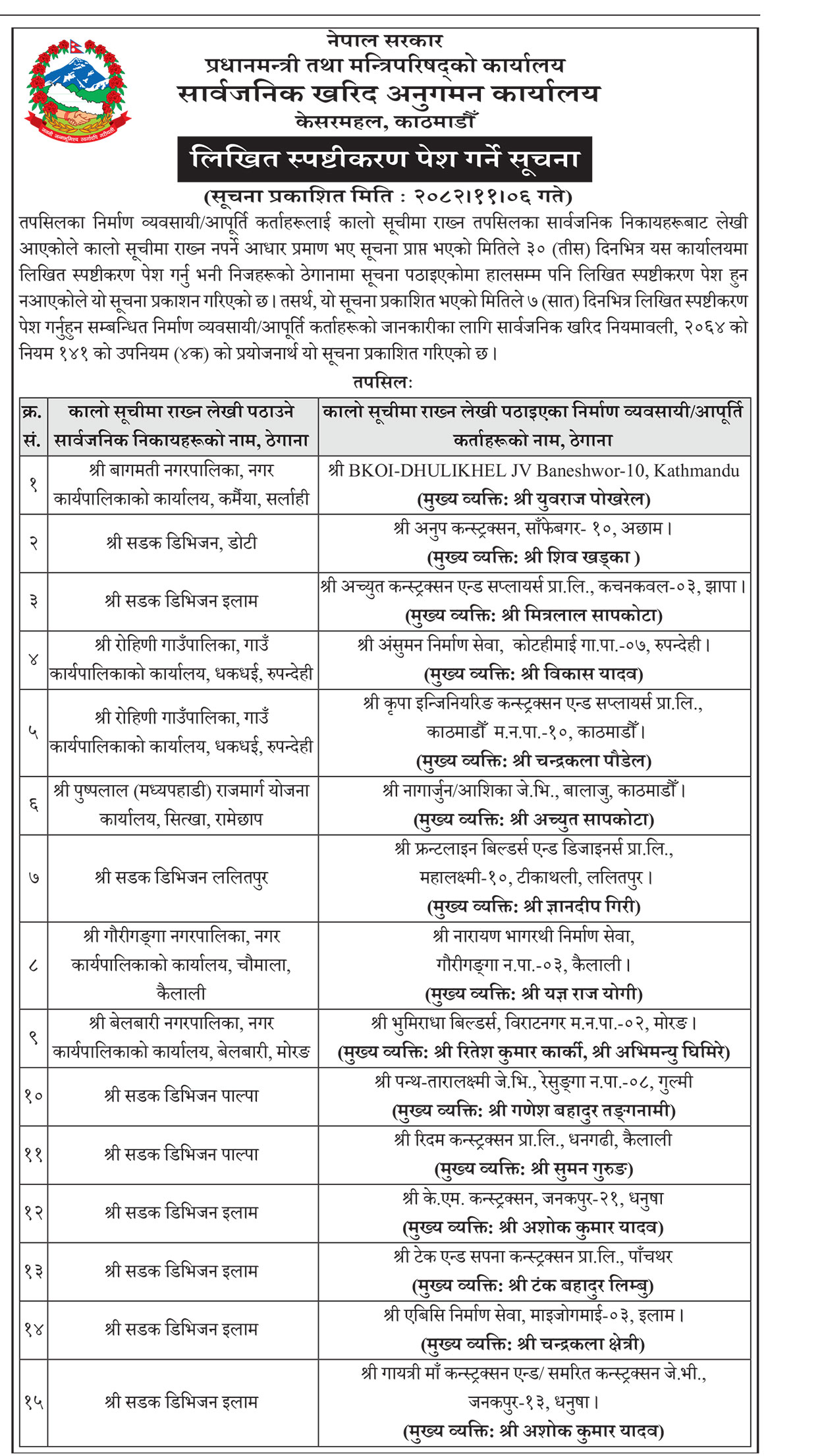 सार्वजनिक खरिद नियमावली, २०६४ को नियम १४१ को उपनियम (४क) बमोजिम यो सूचना प्रकाशित गरिएको कार्यालयले जनाएको छ । तोकिएको समयभित्र स्पष्टीकरण नआएमा ती कम्पनीहरूलाई कालो सूचीमा राख्ने प्रक्रिया अगाडि बढाइने छ ।