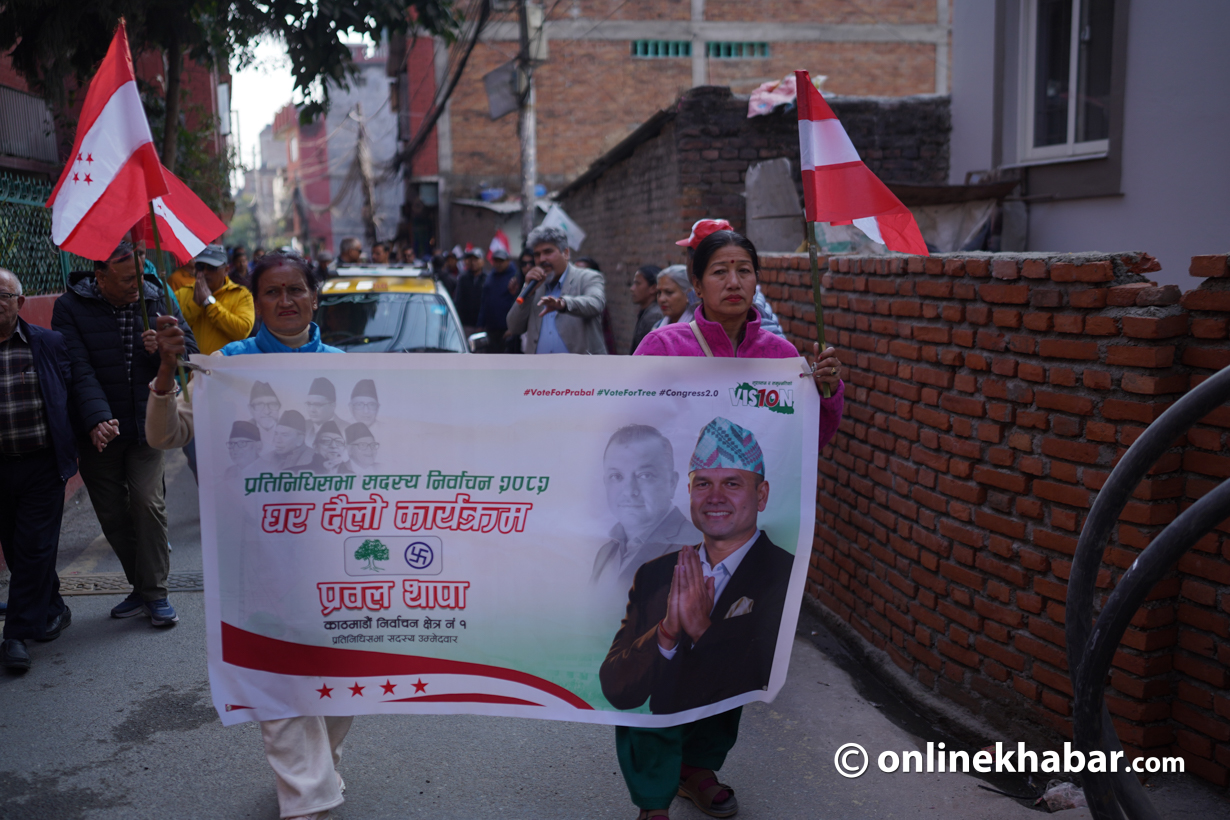 घरदैलो प्रचारको अगुवाइ गर्नेमध्येका एक जनाले ‘बदलिएको कांग्रेसले मुलुकको बागडोर सम्हाल्ने’ दाबीसहित मत माग्न थाले । दुई महिलाले चुनावी ब्यानर समातेर घरदैलो प्रचारका टोलीसँगै अघि बढे । घरदैलो प्रचार ब्यानरमा भनिएको छ, ‘प्रतिनिधिसभा सदस्य निर्वाचन २०८२, घरदैलो कार्यक्रम प्रवल थापा, काठमाडौं क्षेत्र नम्बर-१ प्रतिनिधि सभा सदस्य उम्मेदवार ।’